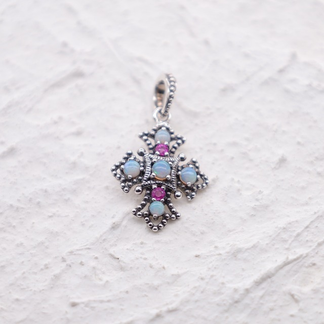 禄山 花飾りのクロス ペンダント シードパールとターコイズ