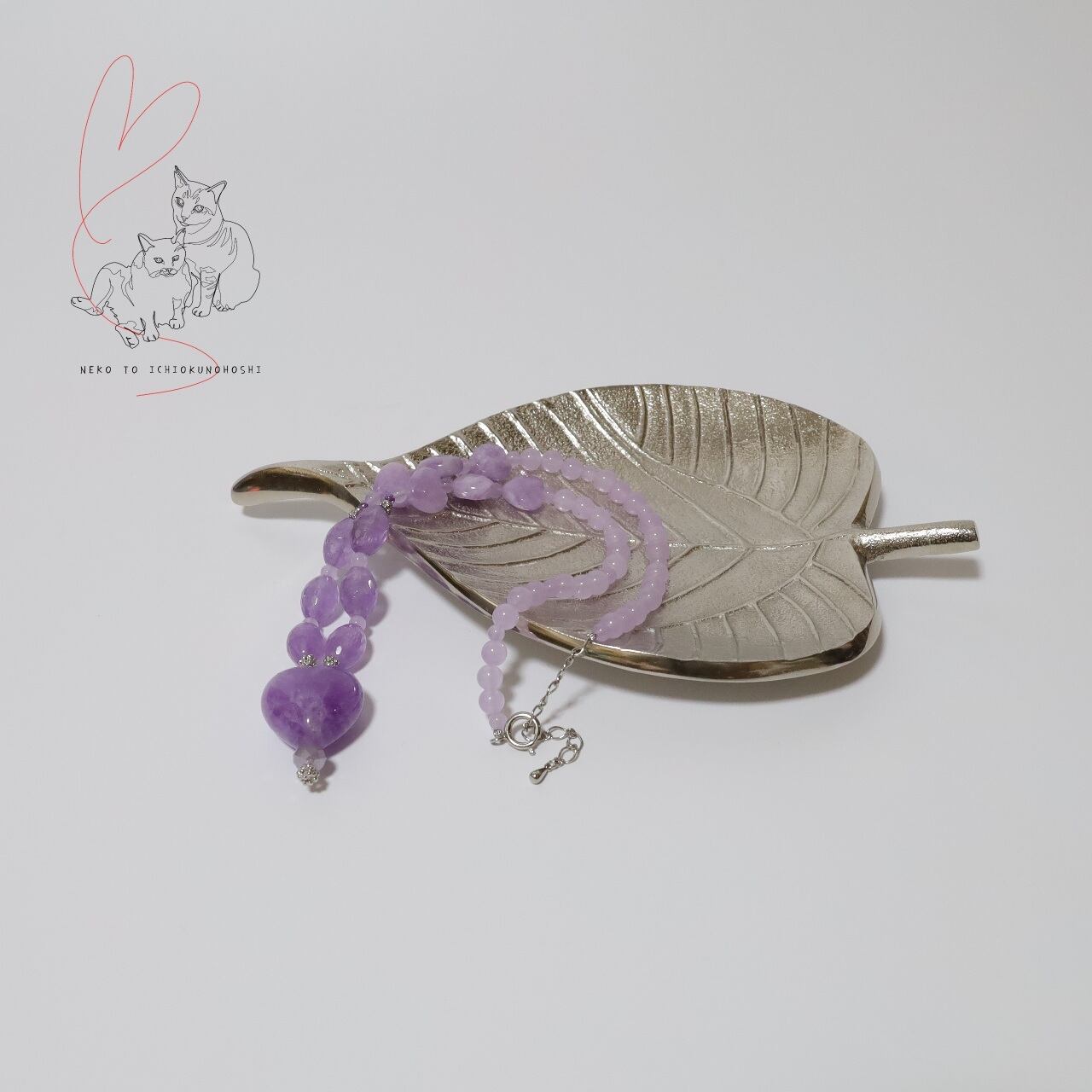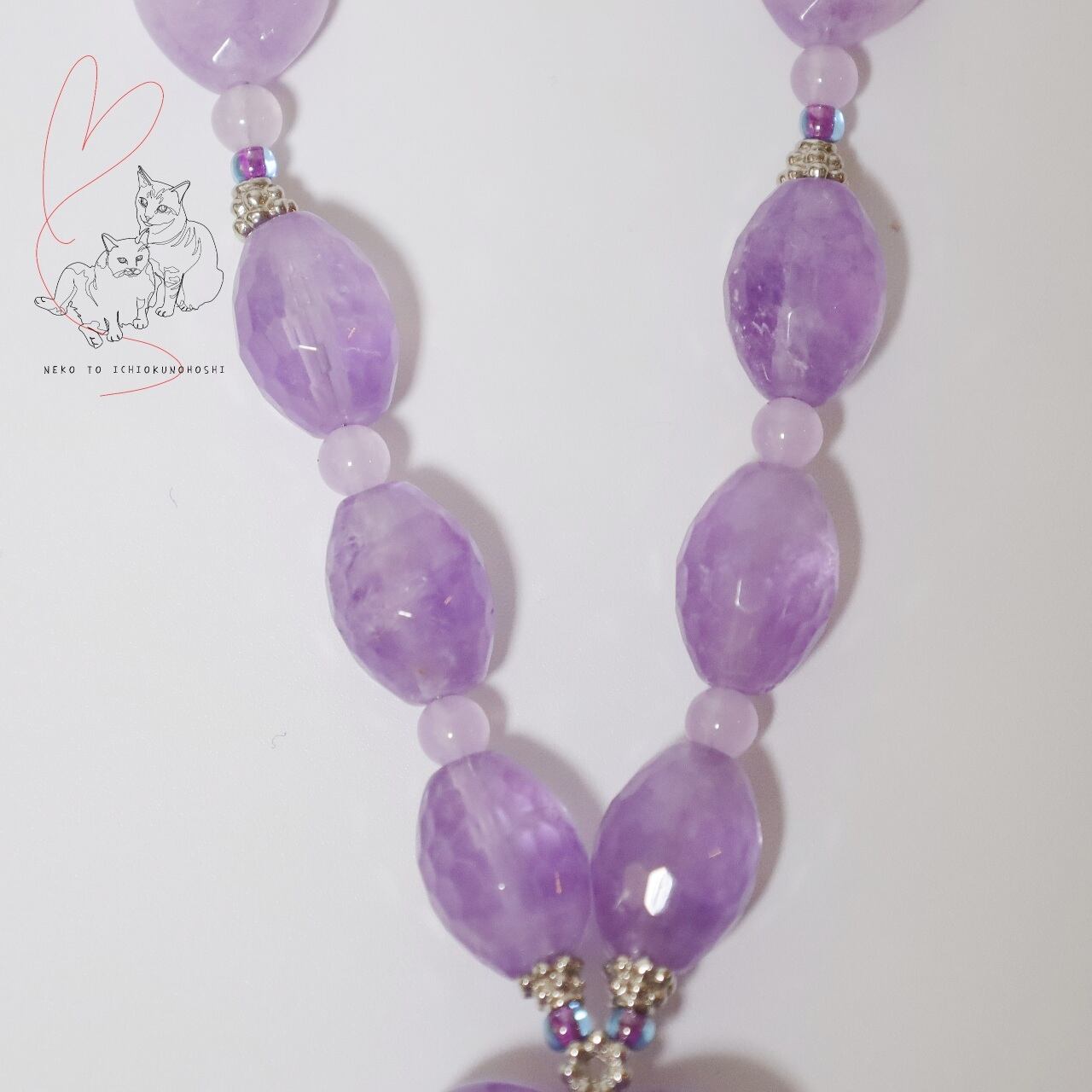 トップに大粒のハート型にカットされたアメシストをあしらった、グラデーションが美しいネックレスです。