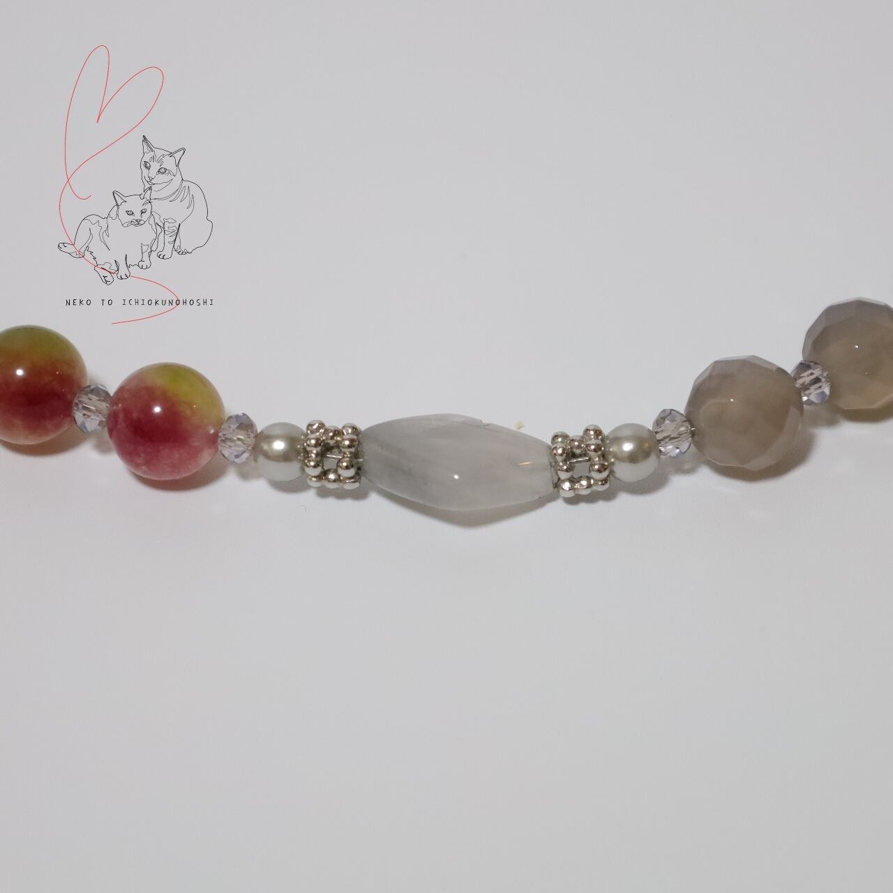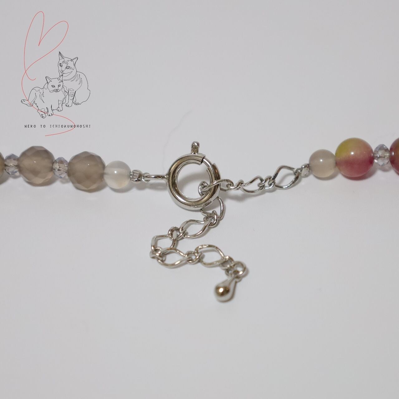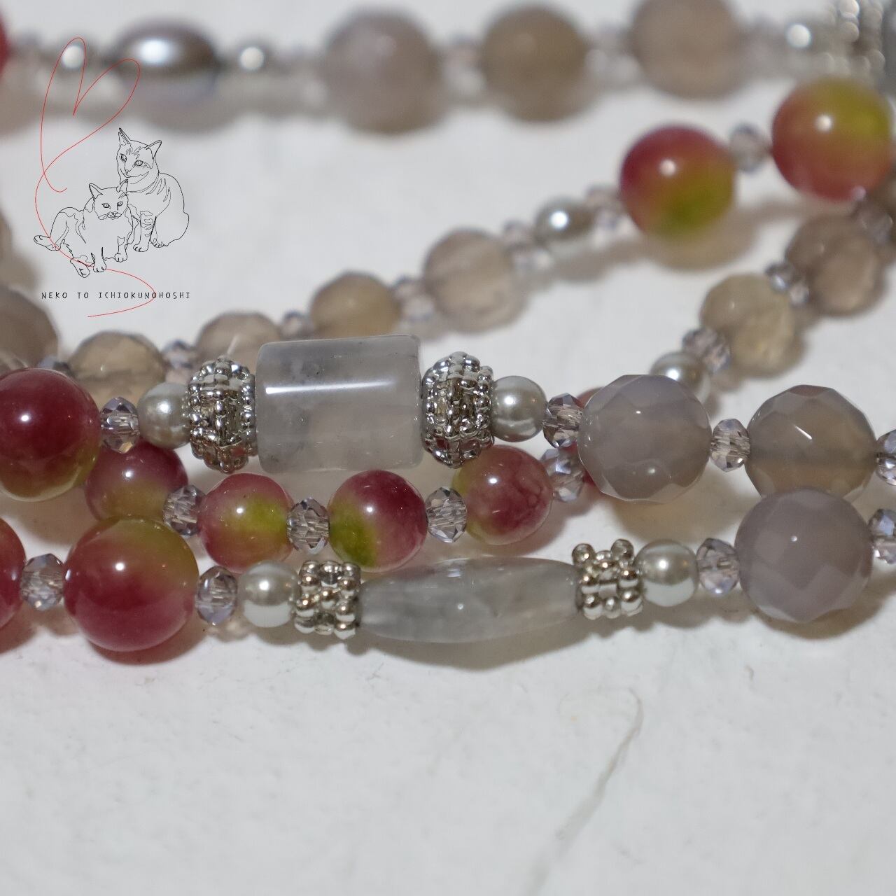 そこにグレイのパールやアゲートを差し込んだオールシーズン使いやすい、肌馴染みの良い美しい天然石のネックレスに仕上げました。