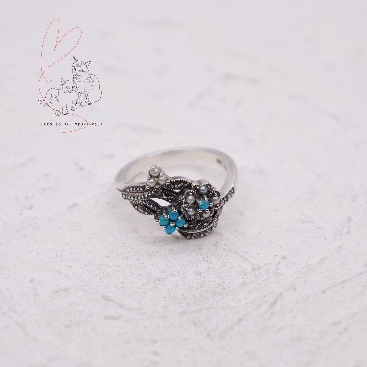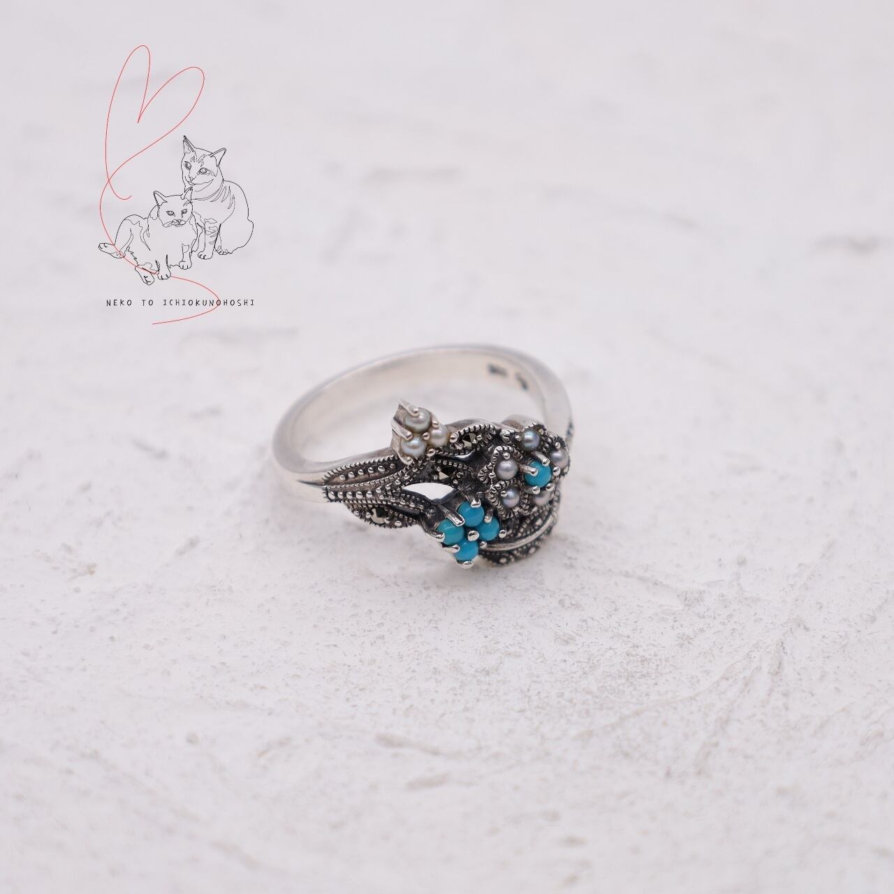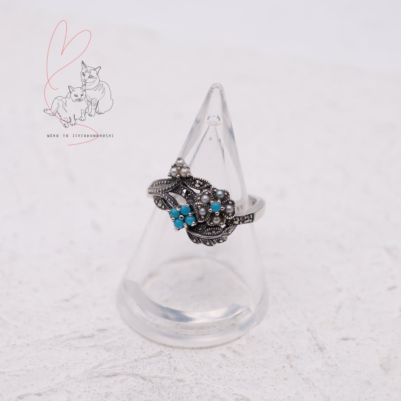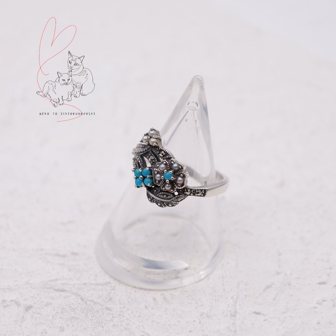 小粒ながら美しいオパール、煌めくマルカジット、エレガントな極小のシードパールで作られたアンティーク調の指輪です。