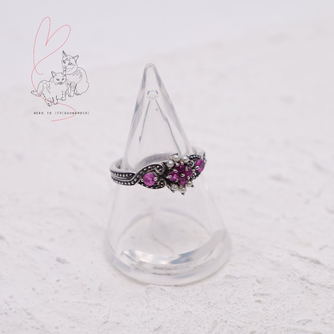 ルビーの煌めきとそこに寄り添うシードパールが美しい、とてもエレガントな指輪です。