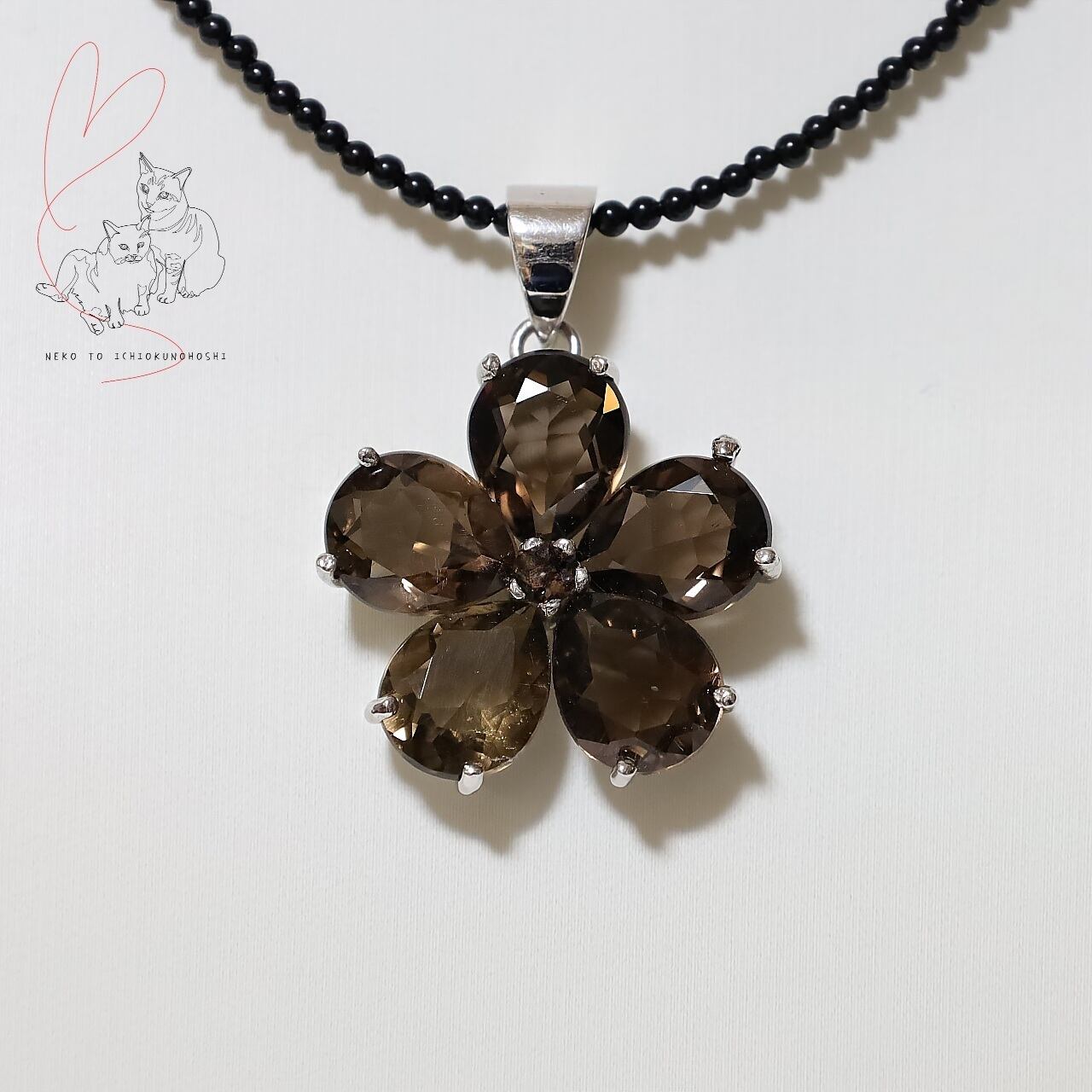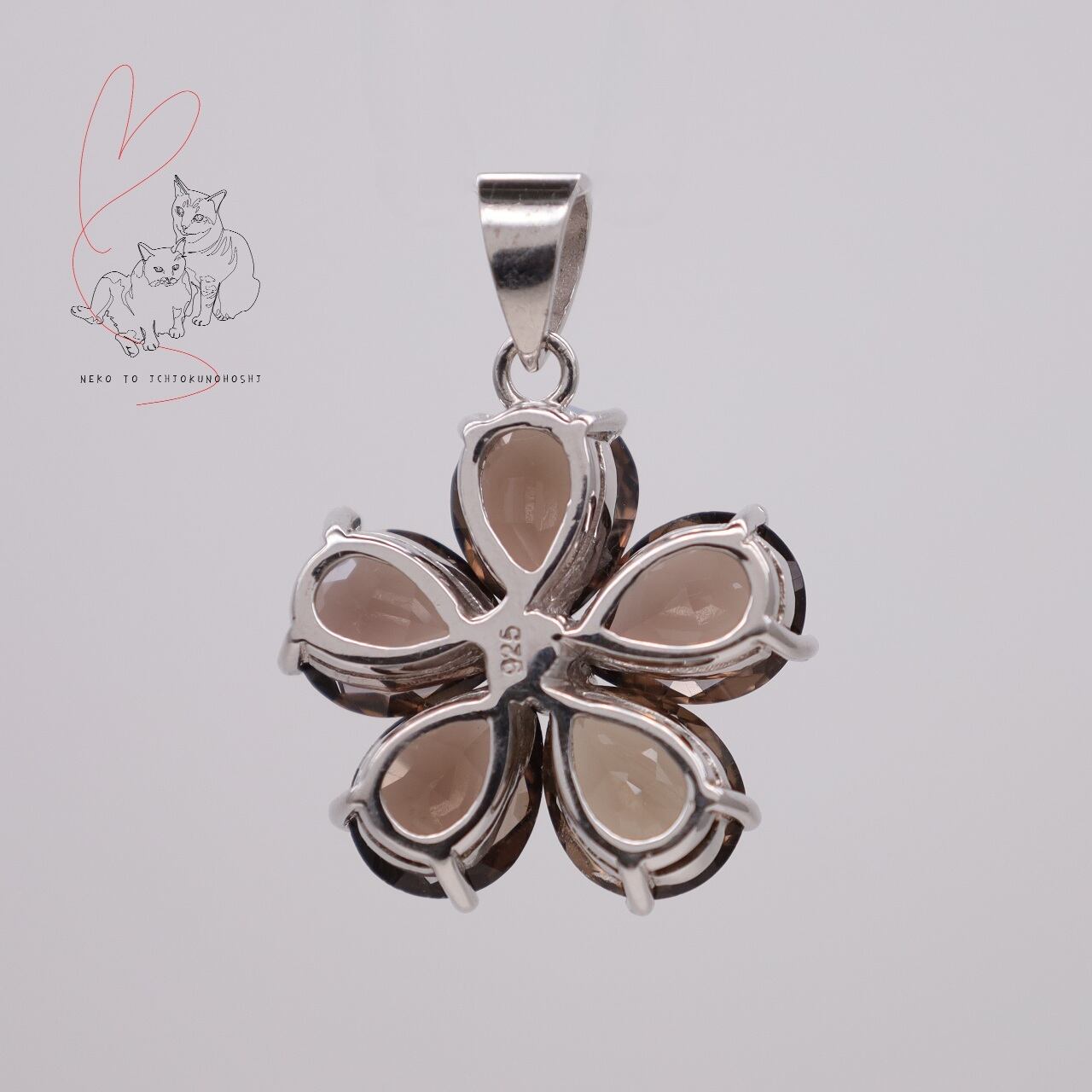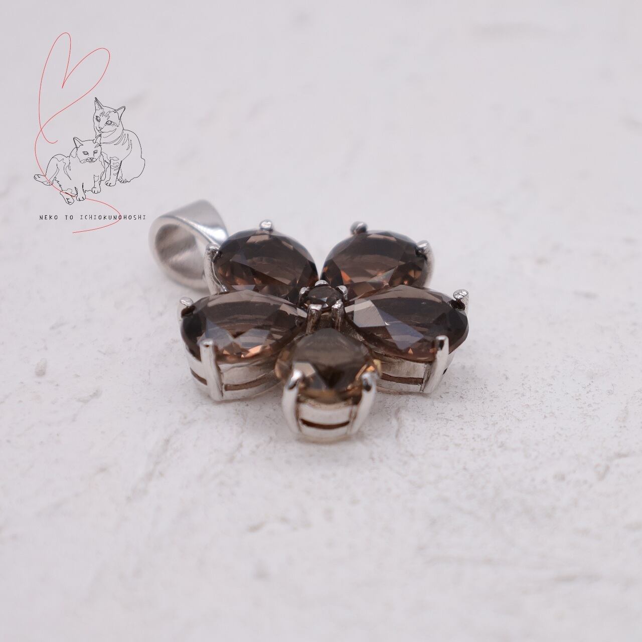 可愛らしいフラワーモチーフですが、大粒のスモーキークォーツ、ダークな色味で大人テイストのジュエリーです。