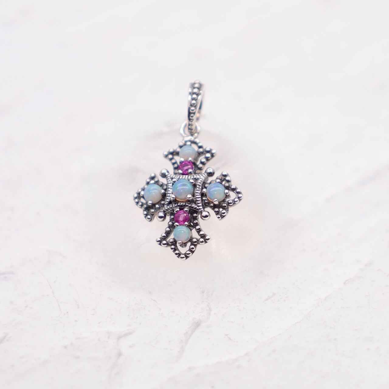 小さなクロスですが、存在感のあるルビーと游色効果のあるオパールの神秘的な色合いに目を奪われます。