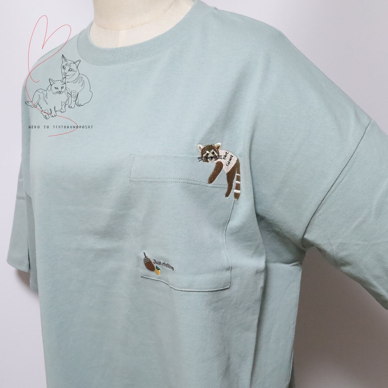 なんかカワイイ まったりのんびりアライグマの刺繡Tシャツ ミント