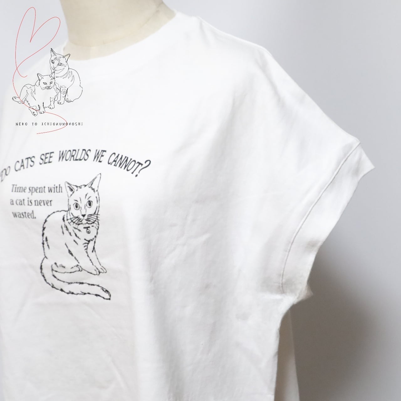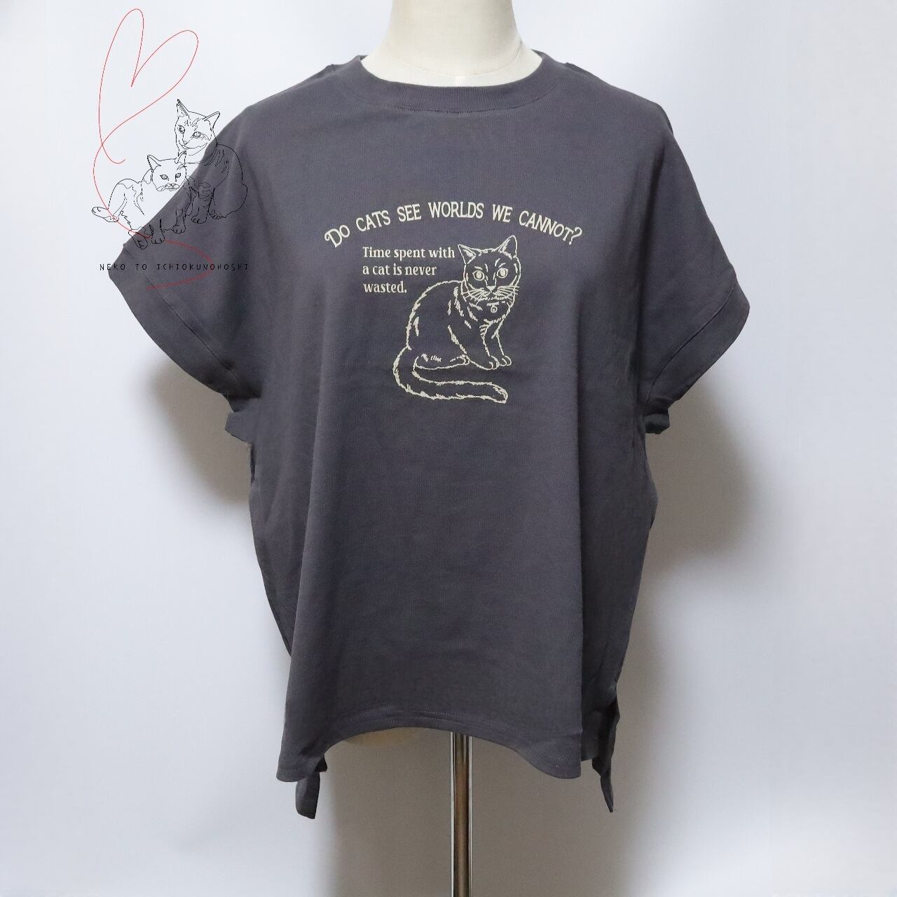 胸元には、どこか哲学的なメッセージと、愛嬌たっぷりの猫イラストがプリントされ、