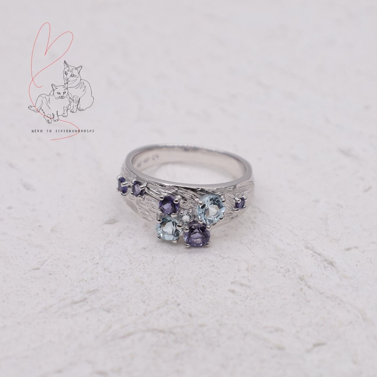 美しいアイオライトとブルートパーズで彩った星座をリングに閉じ込めました。