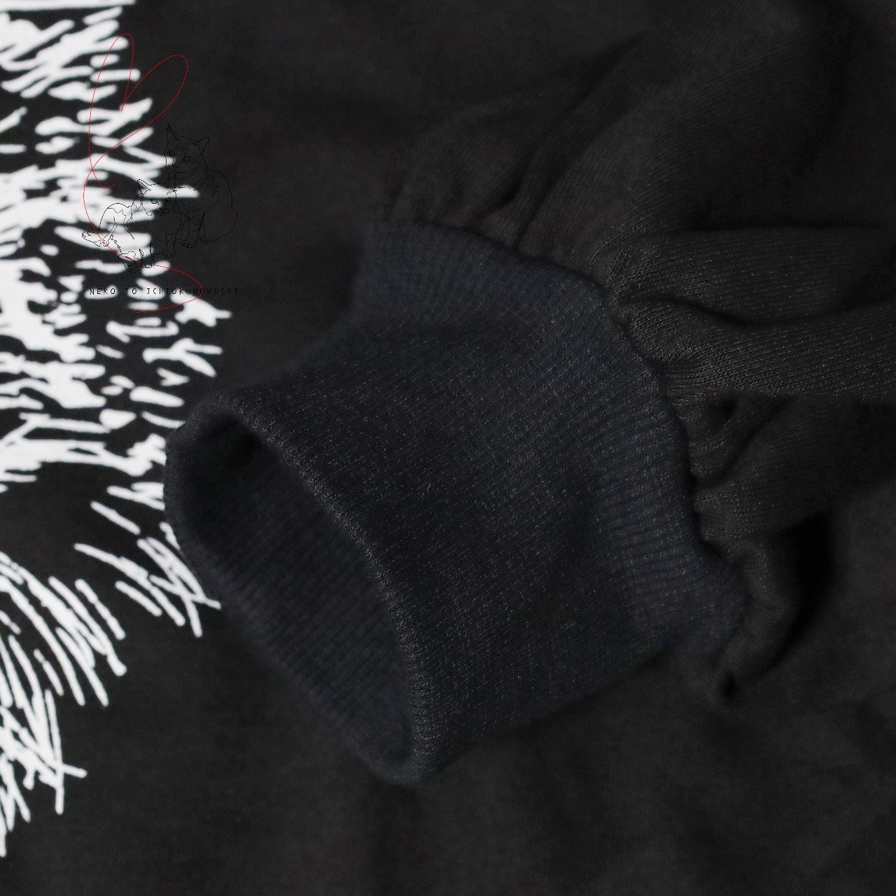 胸元に描かれた繊細なタッチの猫のイラストが、シンプルなデザインに遊び心をプラスしています。