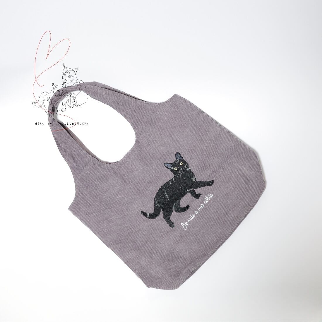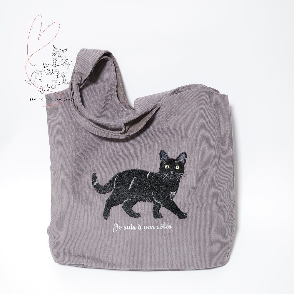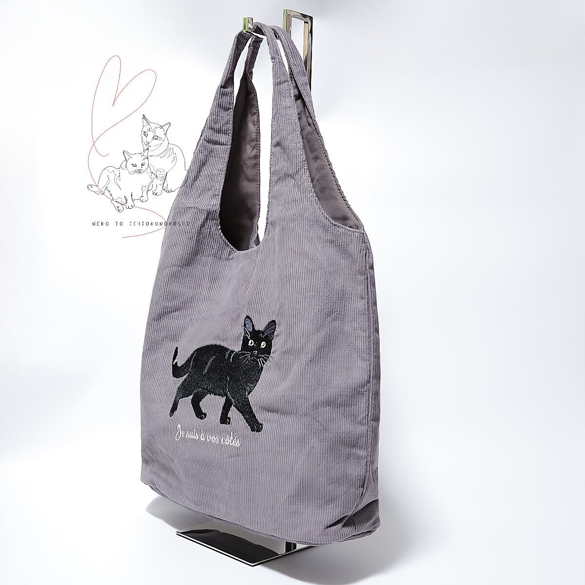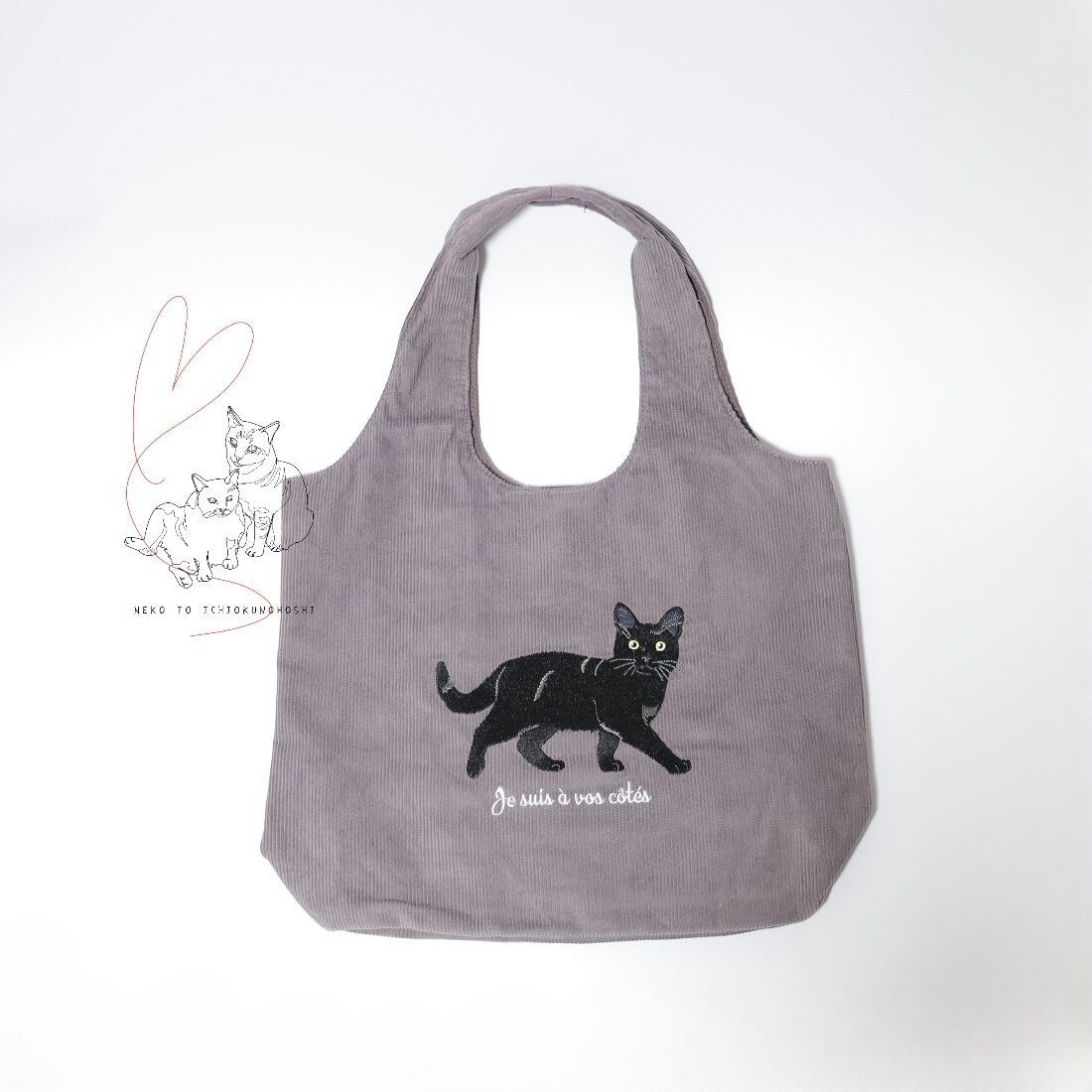 COCOALT 猫デザイン刺繡コーデュロイトートバッグ 黒猫