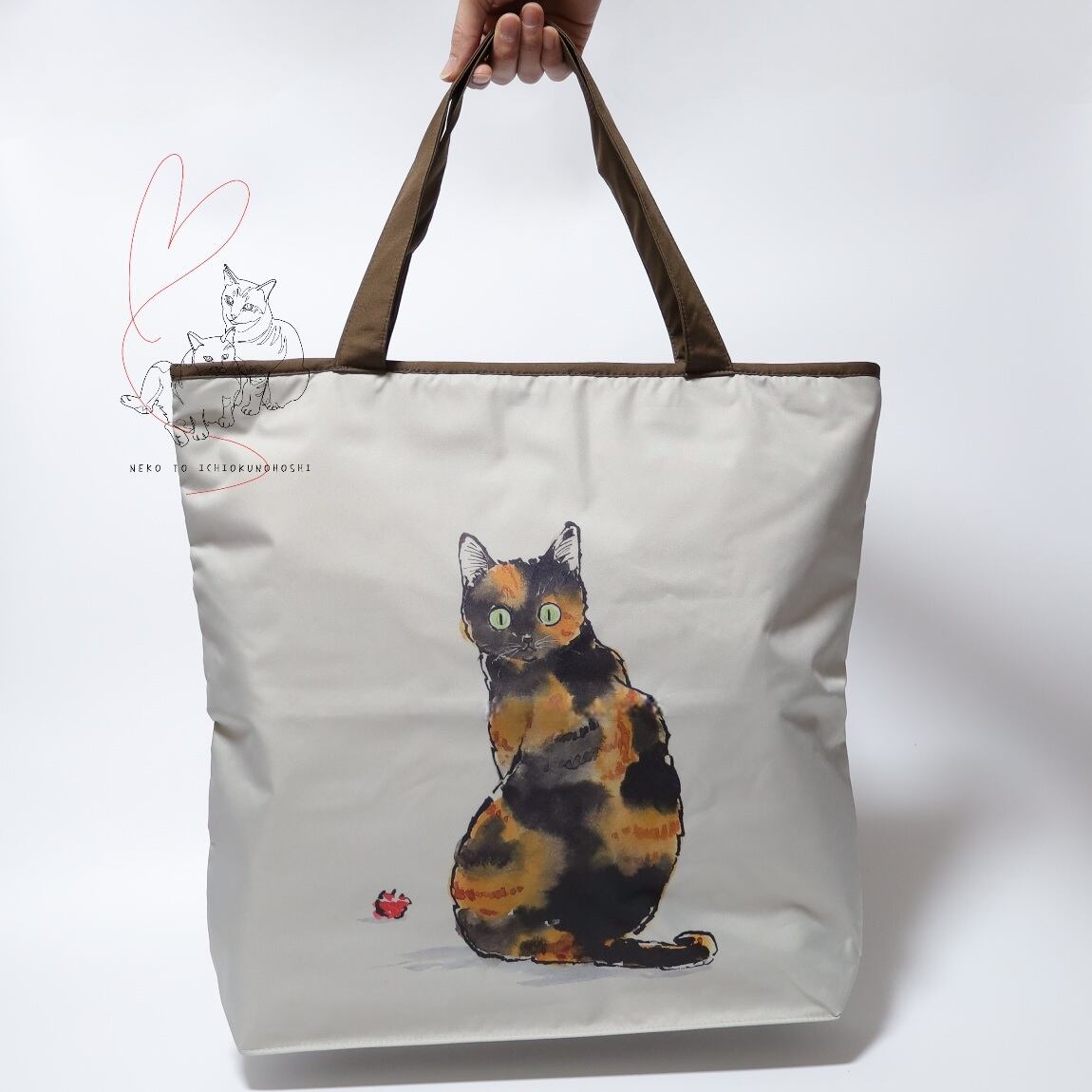 人気作家「ハラミチヨ」さんの可愛らしく大胆なタッチのサビ猫のイラストをトートバッグにプリント。 にじみの独特なグラデーションまで繊細い表現した、キュートなデザインバッグです。