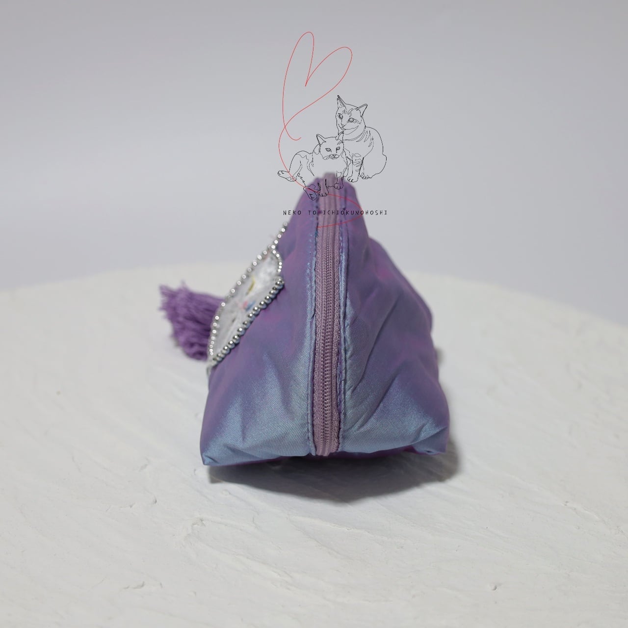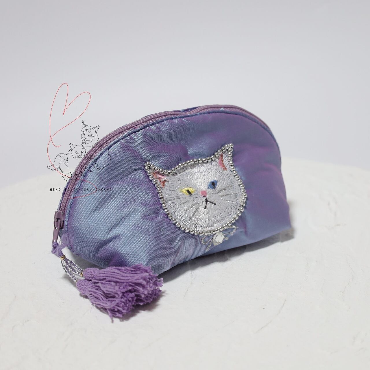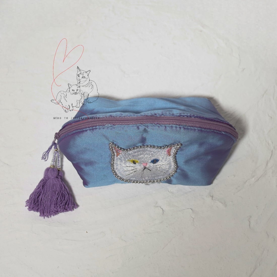 光沢感のある上質な生地に、手刺繡の猫とキラキラのビジューをあしらった可愛らしいポーチです。