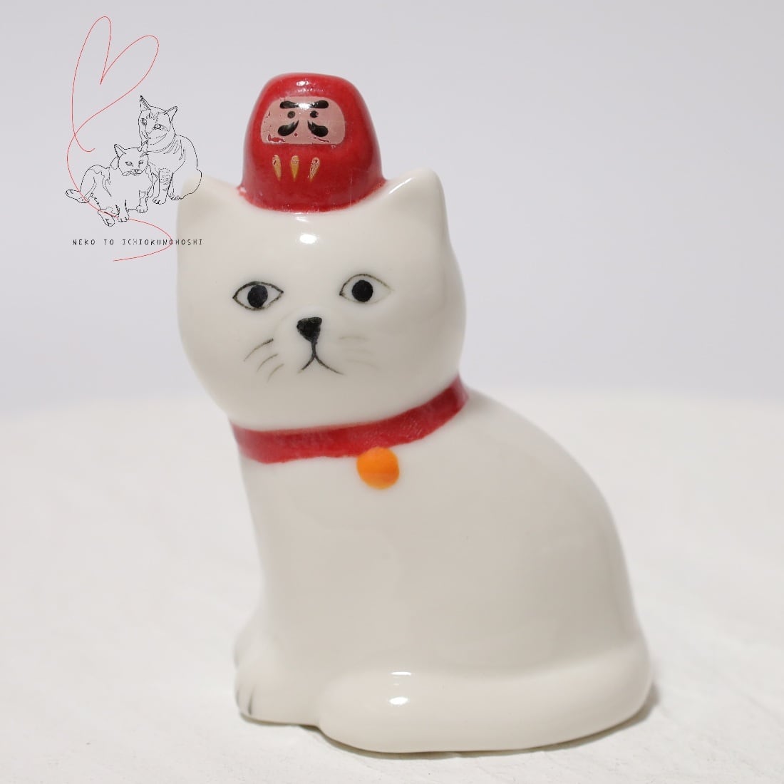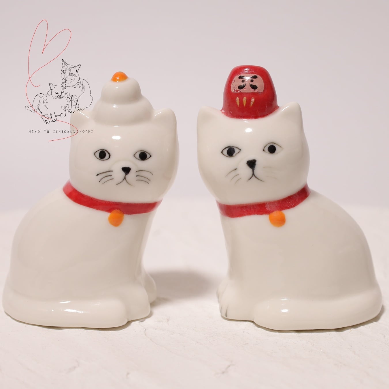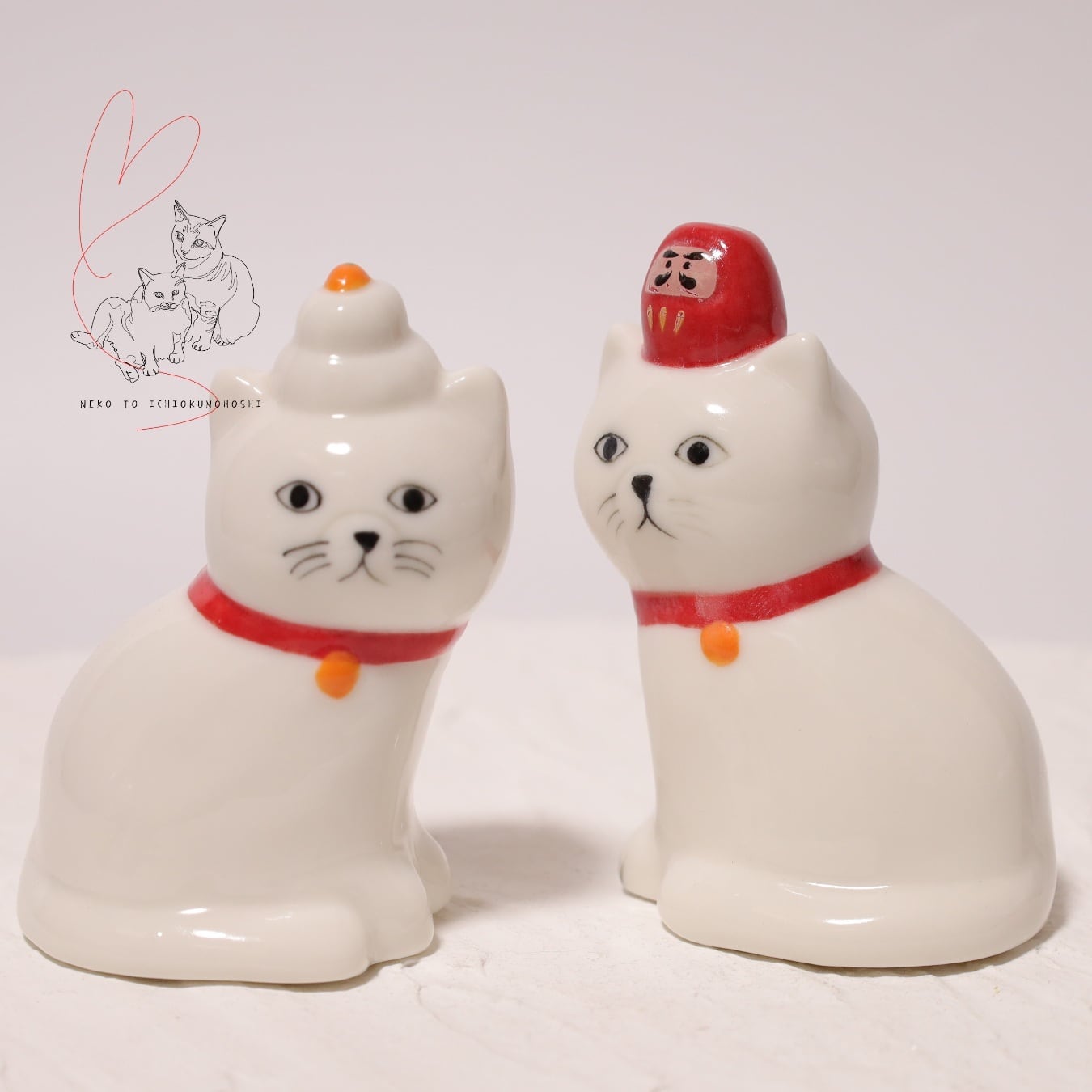 鏡餅を頭にのせた猫と、だるまを乗せた猫が、すました表情でちょこんと佇む姿は、見るだけで心が和みます。