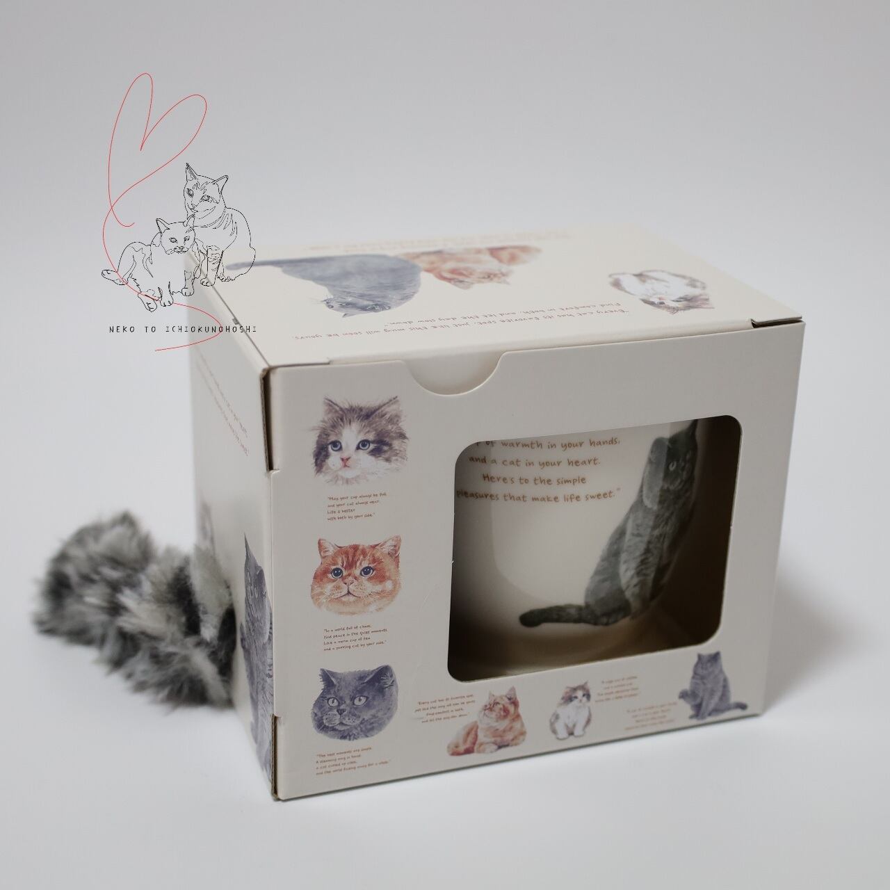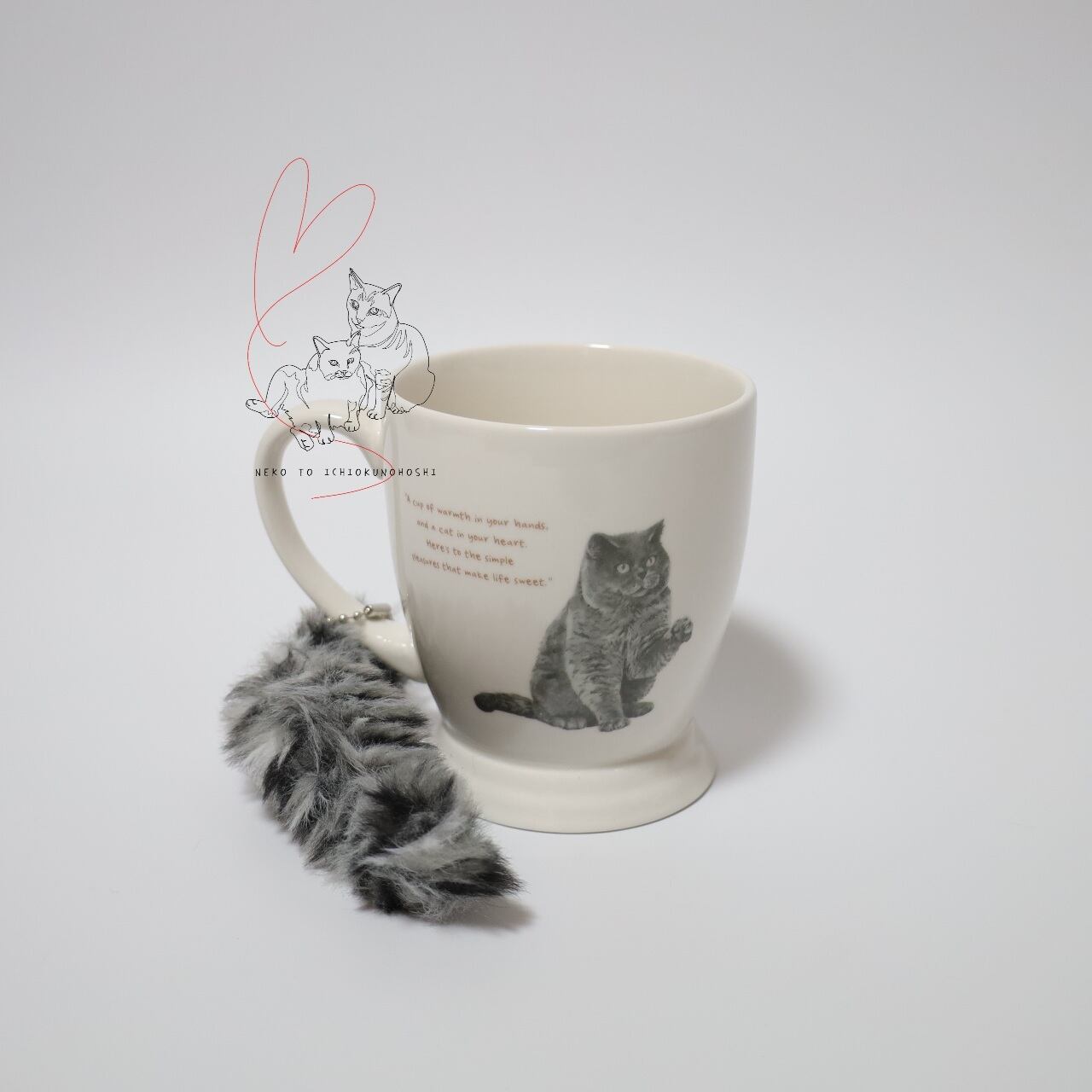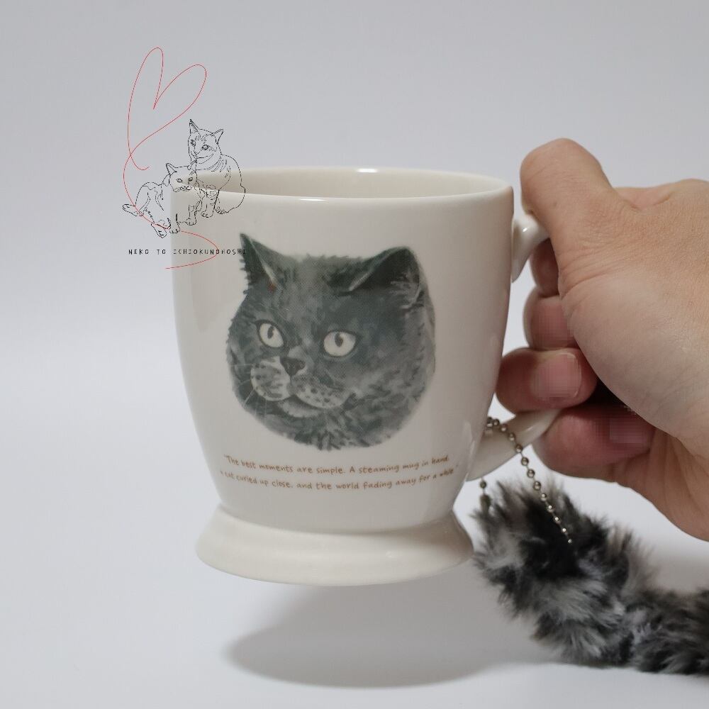 マグカップの両面には可愛いネコのデザインが描かれ、取っ手には自由に形を変えられるしっぽ付き。
