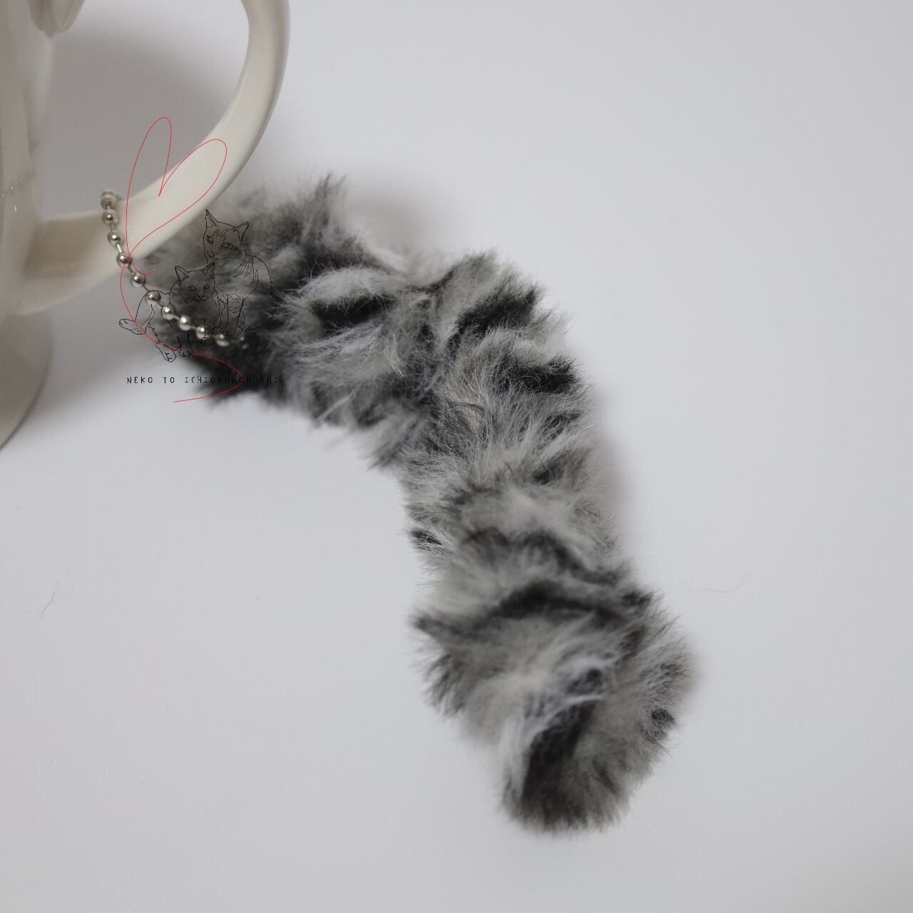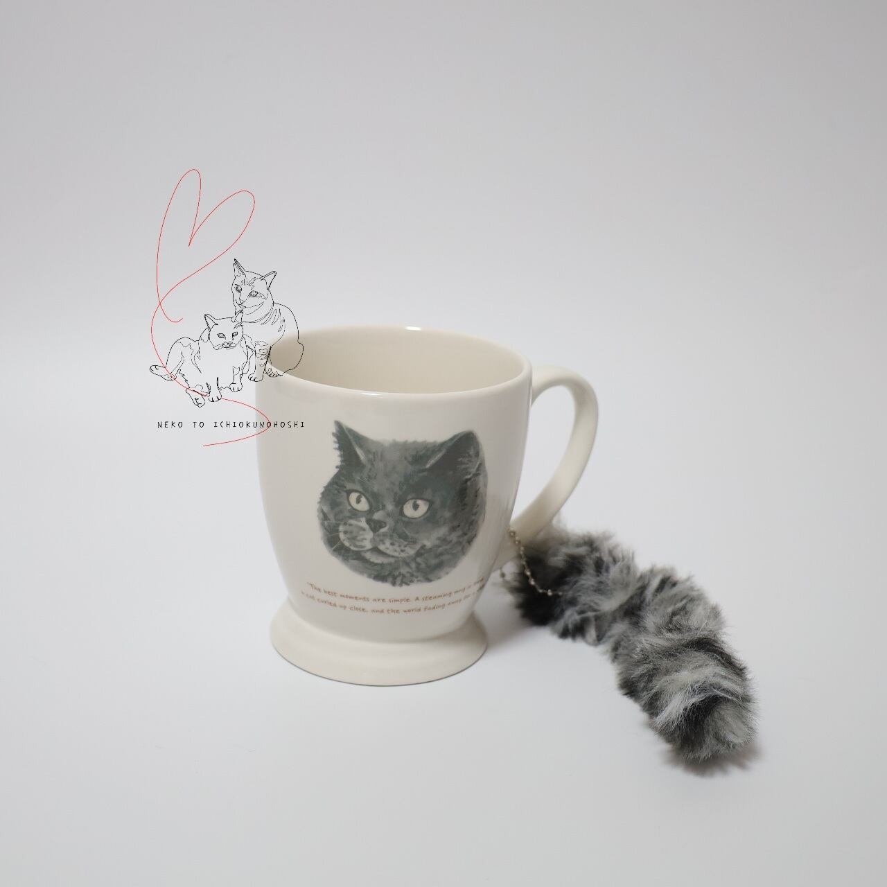猫のしっぽのようなキーホルダーがついたマグカップ。