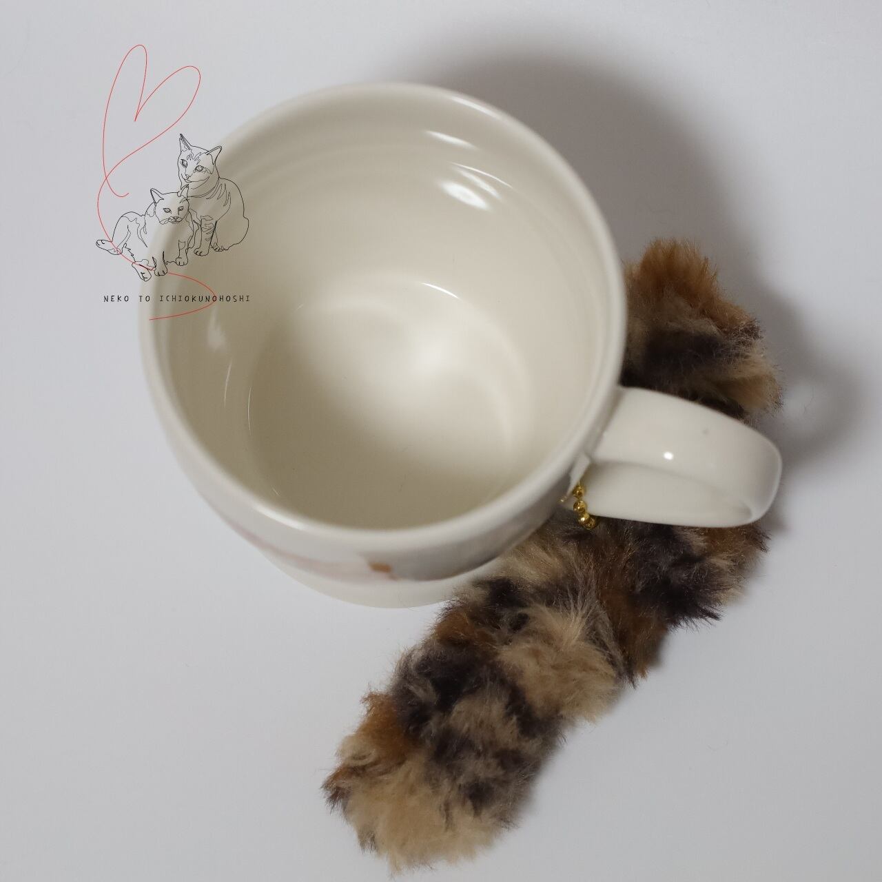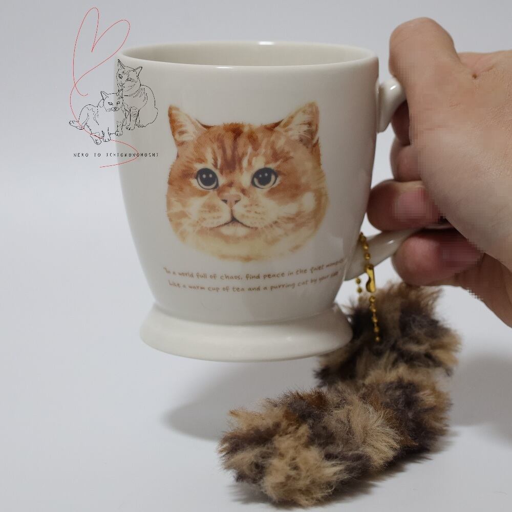 猫のしっぽのようなキーホルダーがついたマグカップ。