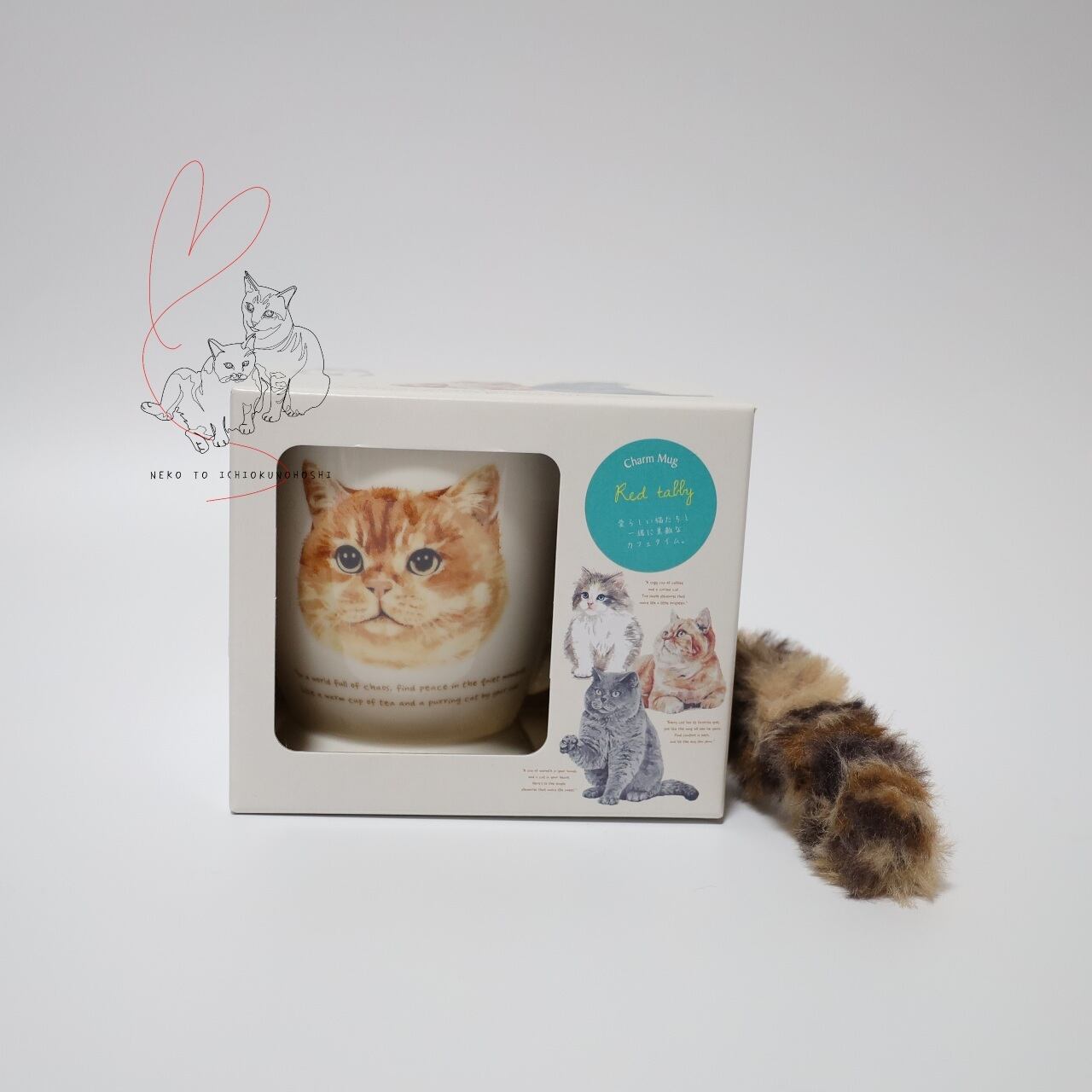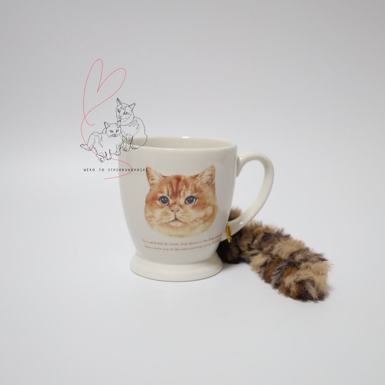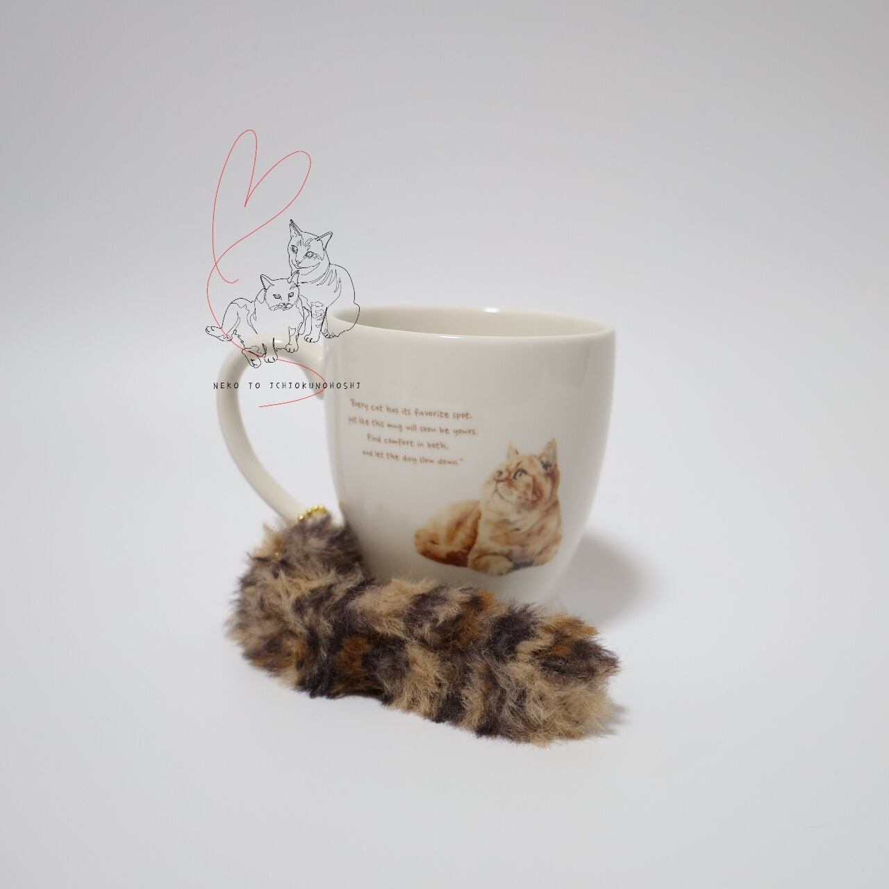 マグカップの両面には可愛いネコのデザインが描かれ、取っ手には自由に形を変えられるしっぽ付き。