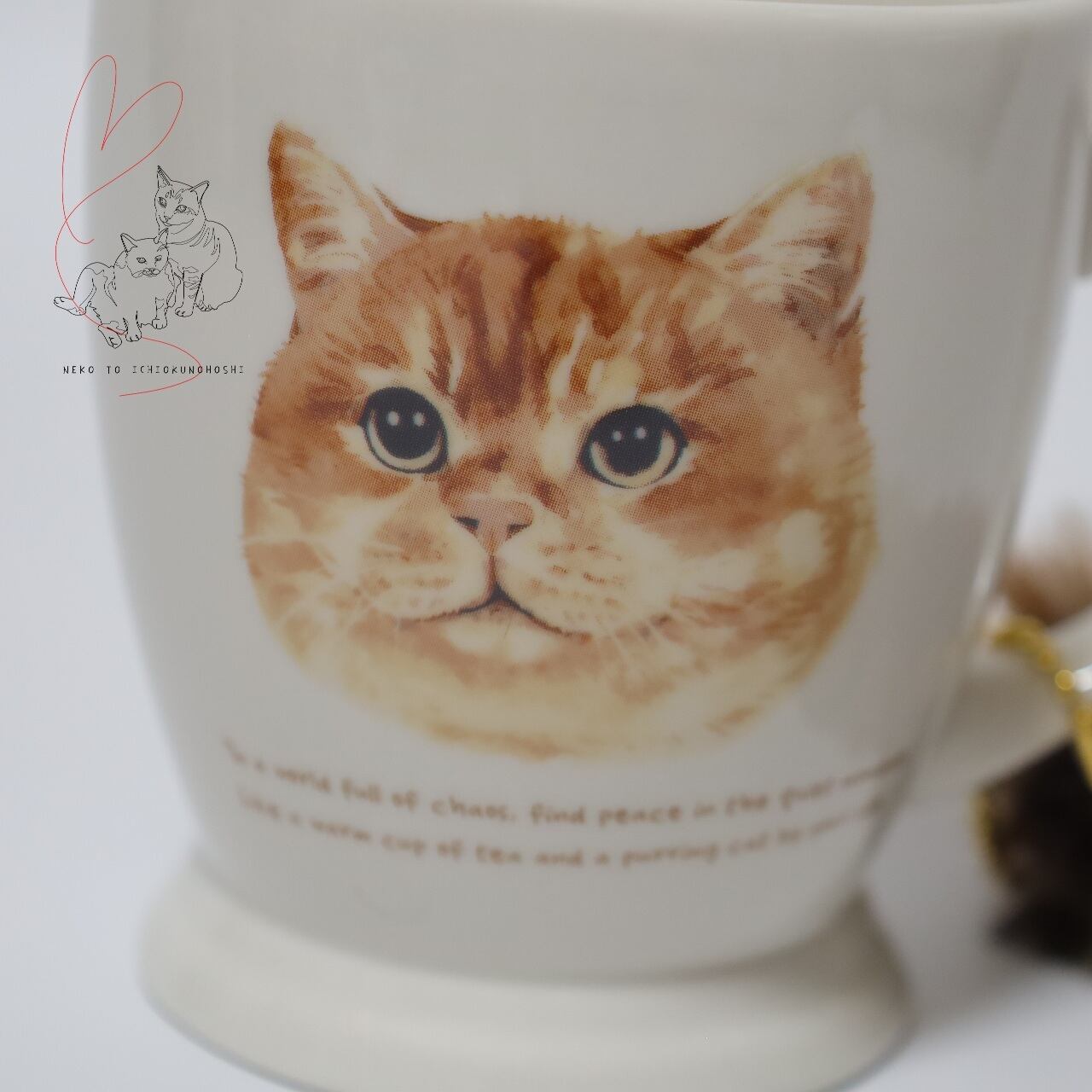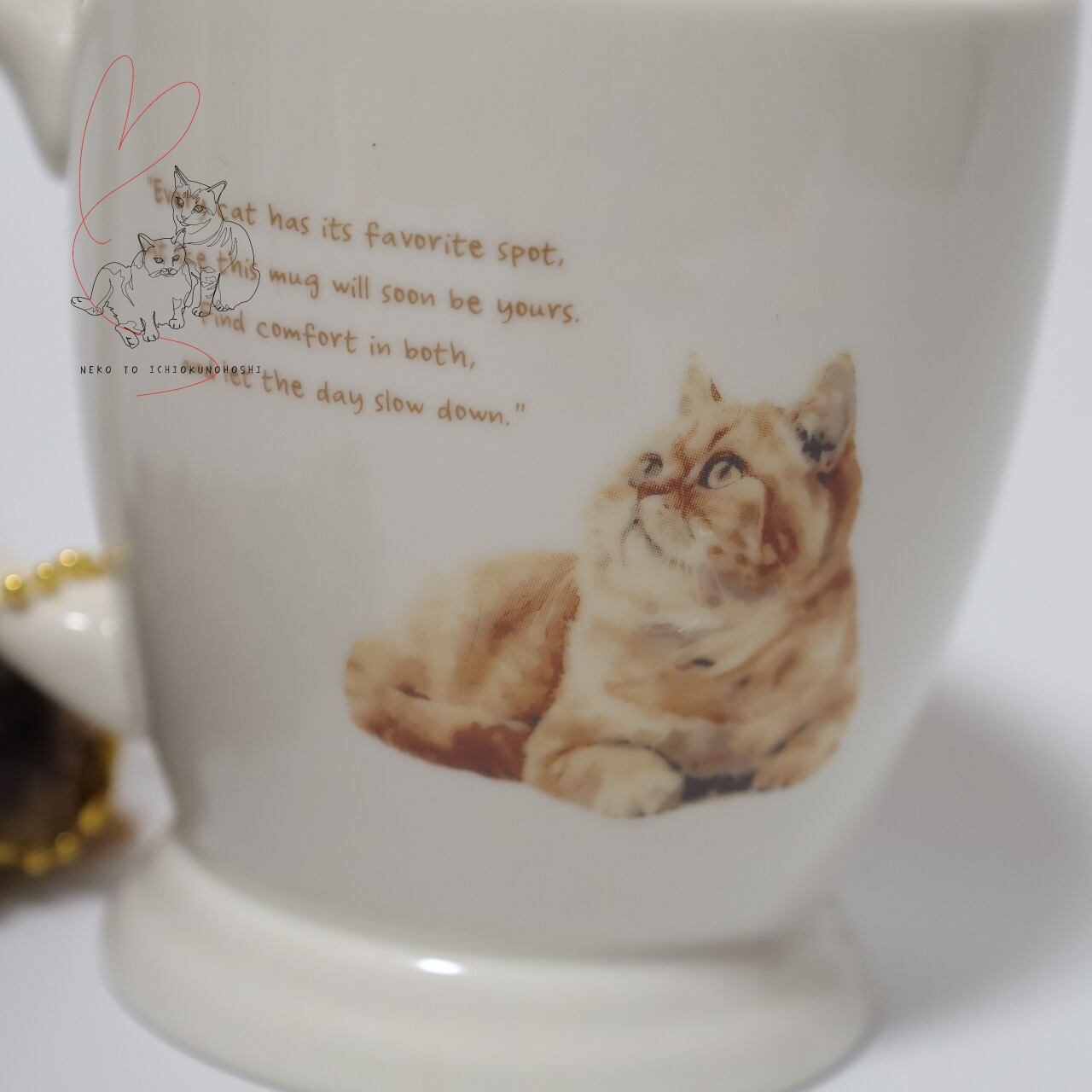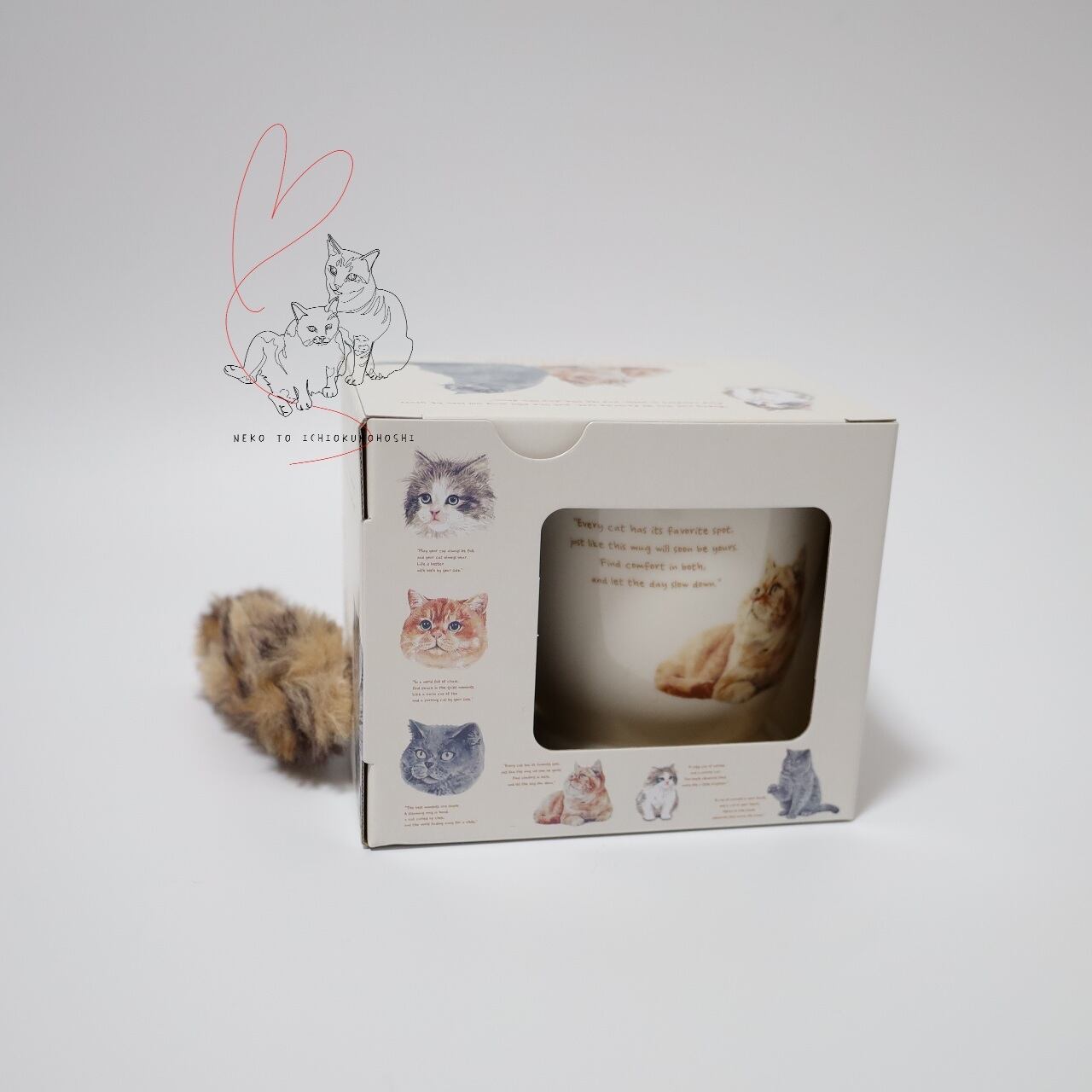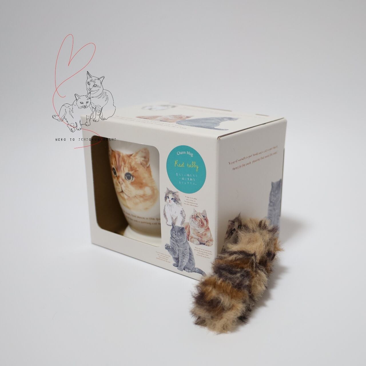 マグカップの両面には可愛いネコのデザインが描かれ、取っ手には自由に形を変えられるしっぽ付き。