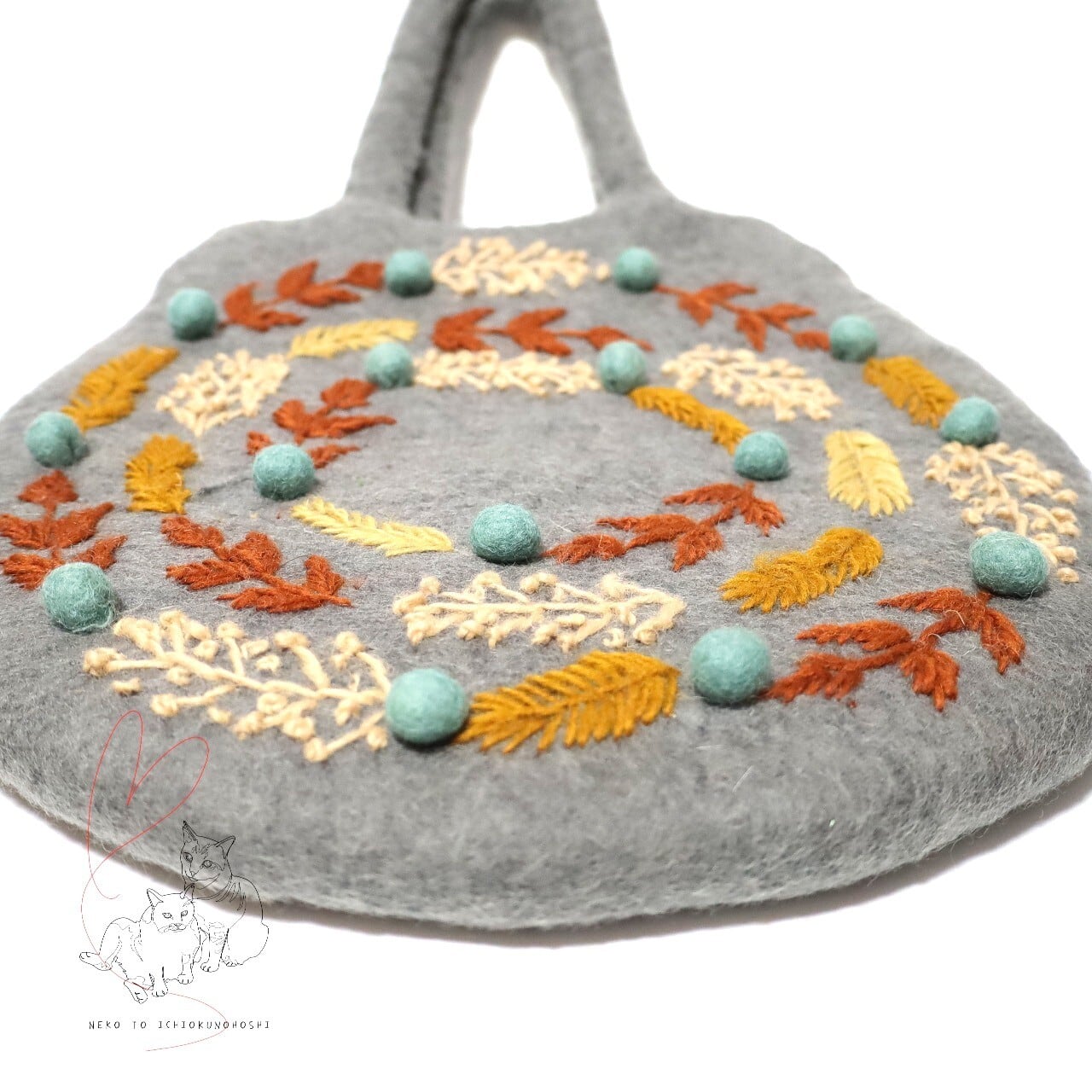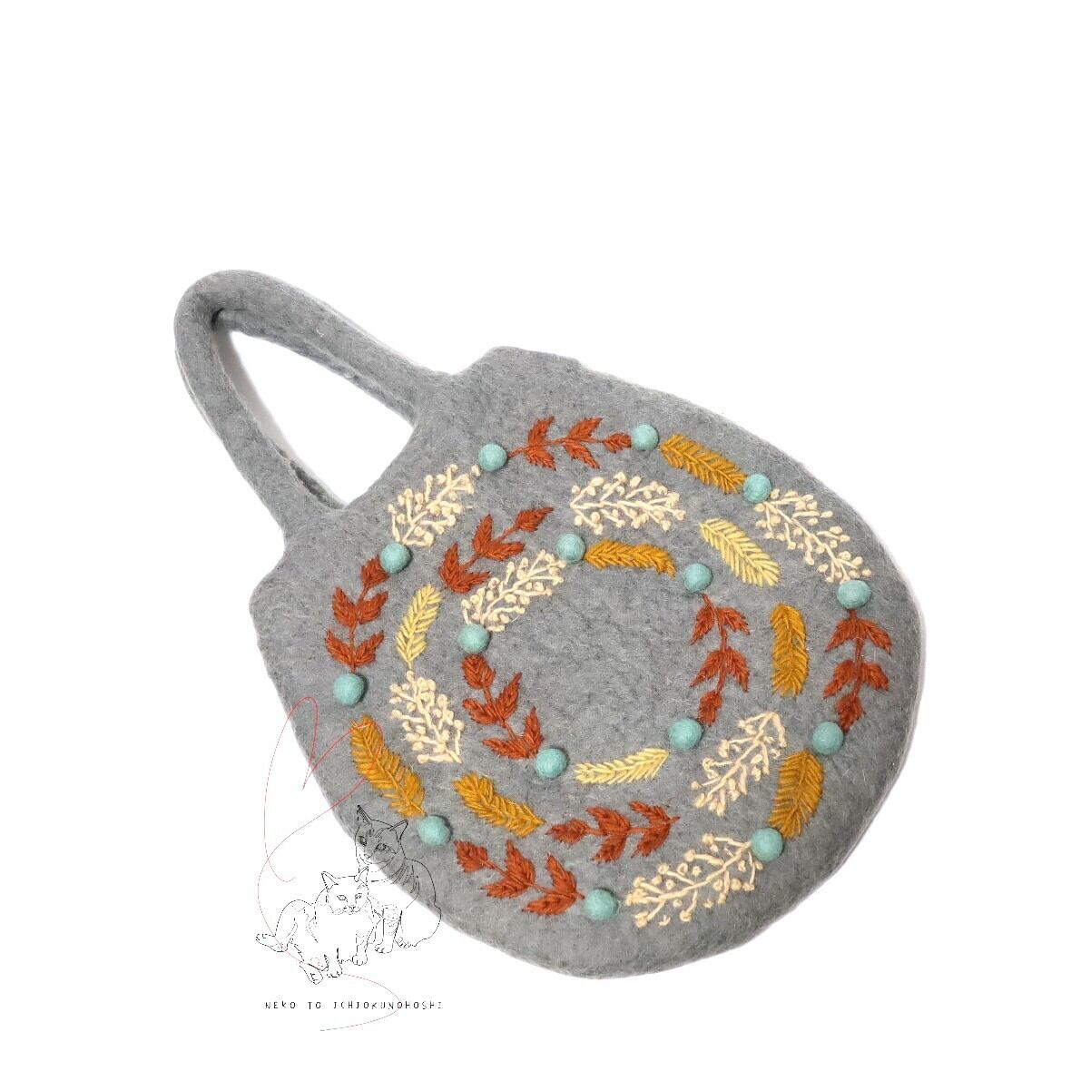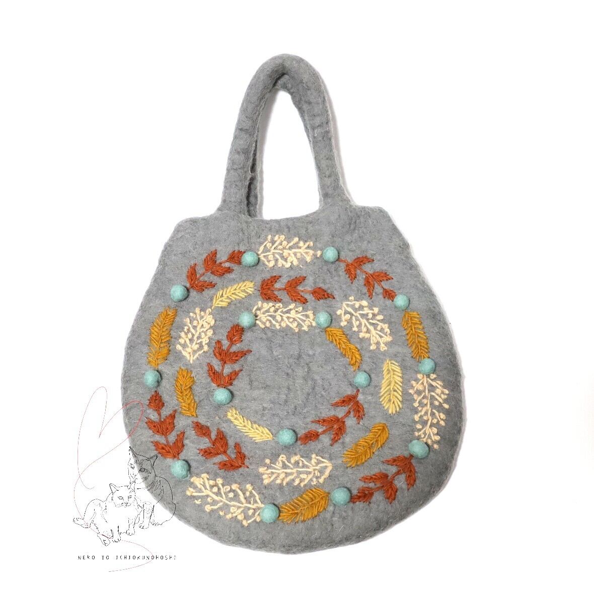 北欧モチーフのような植物刺繍をサークル状に配置し、リースのような優しい雰囲気に仕上げたウールのフェルトバッグです。