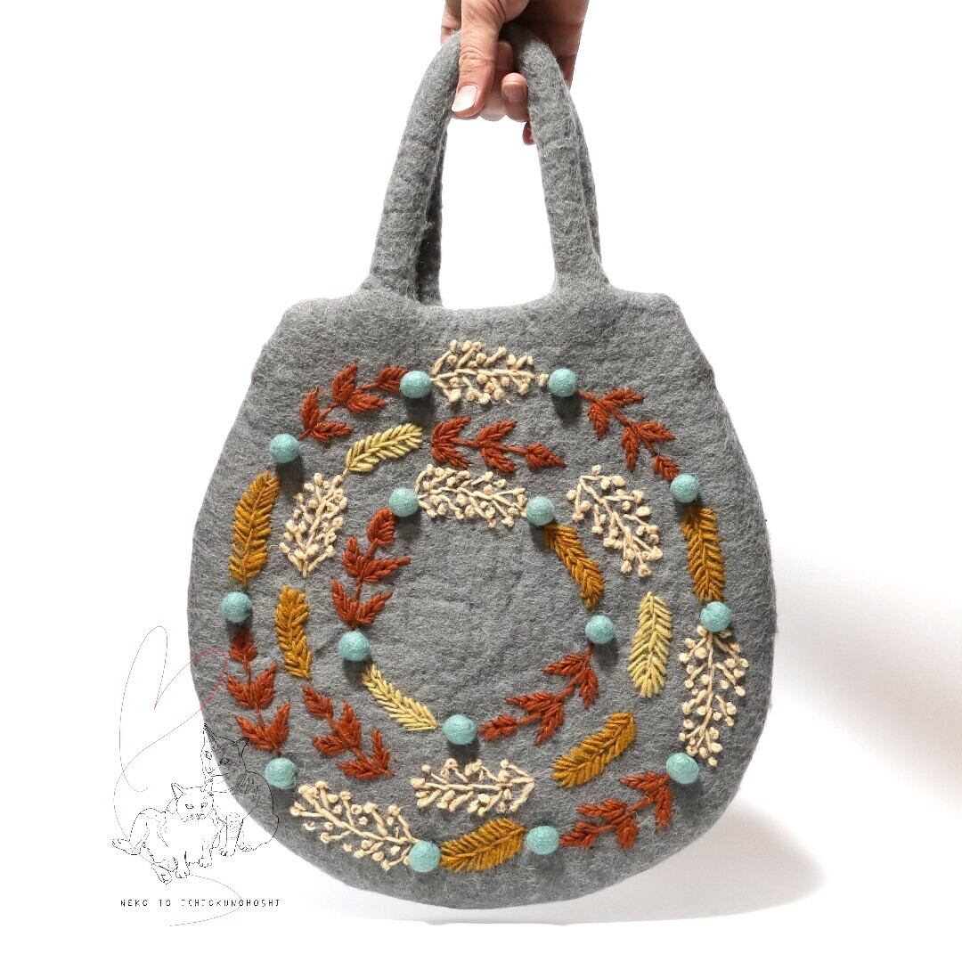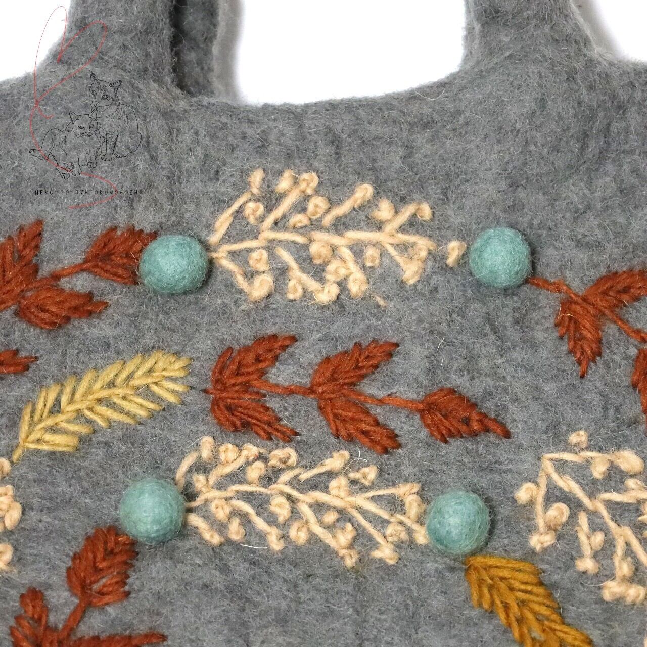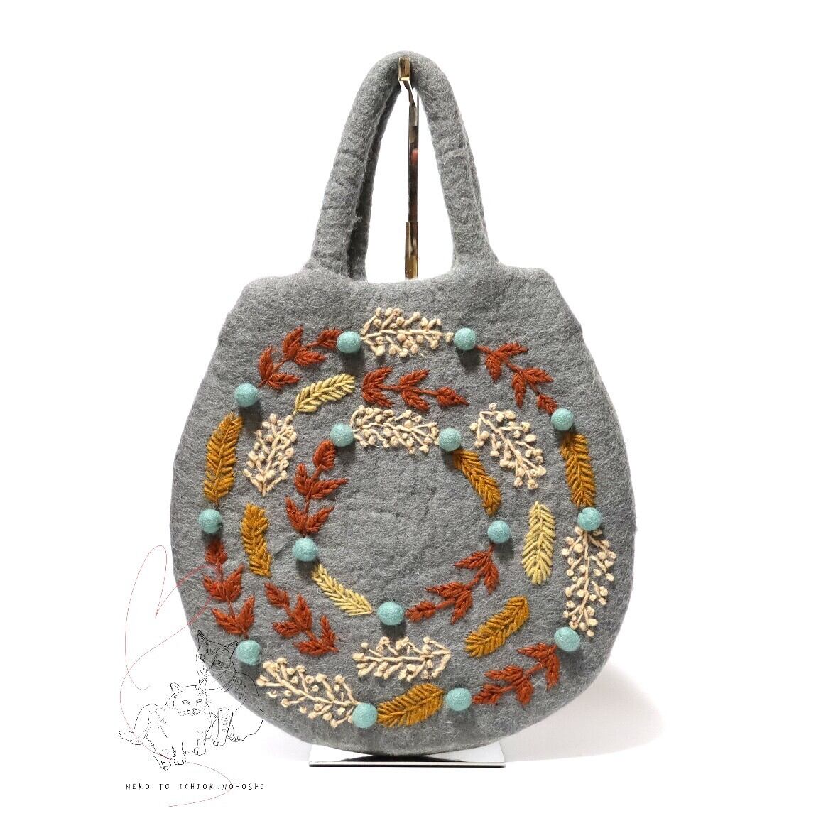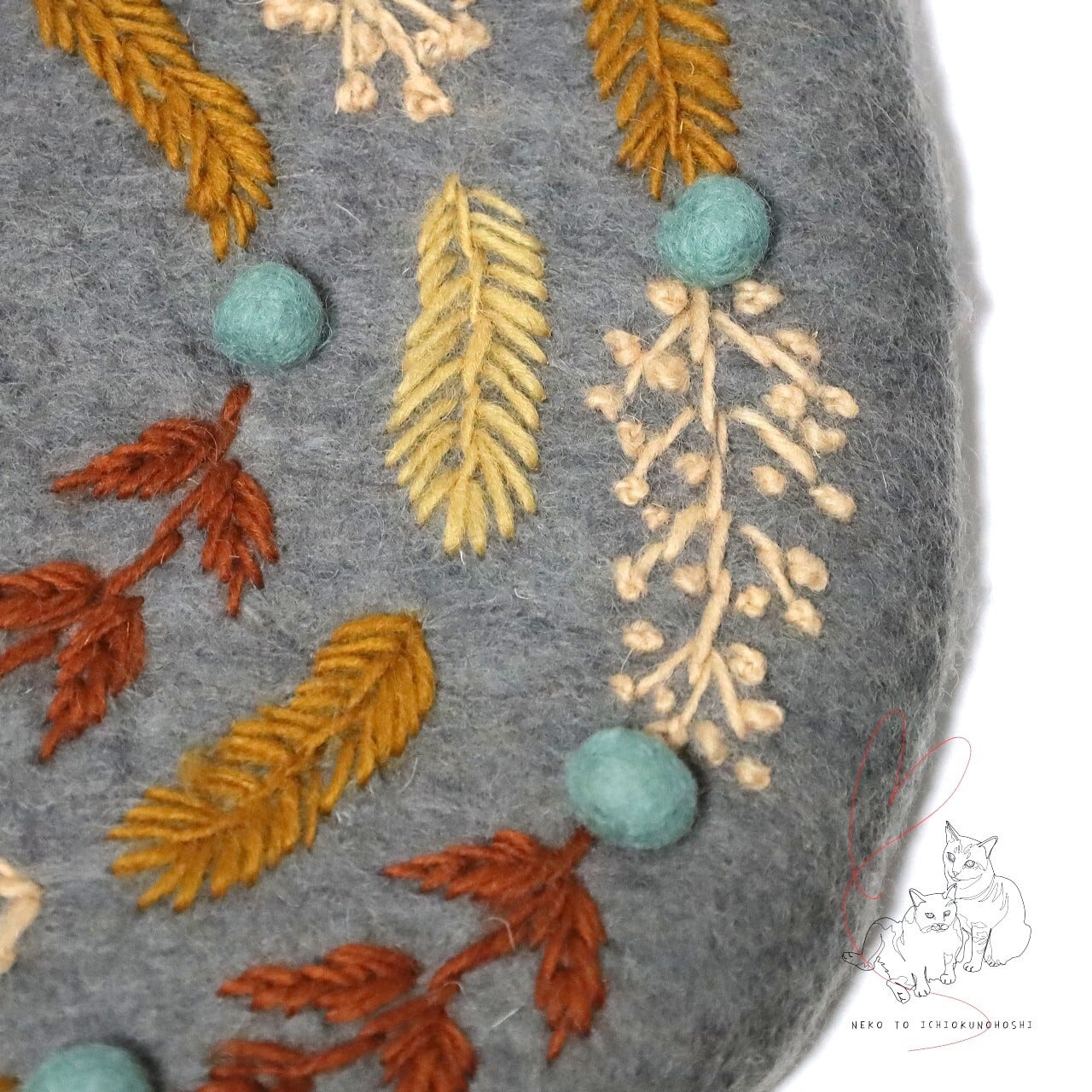 北欧モチーフのような植物刺繍をサークル状に配置し、リースのような優しい雰囲気に仕上げたウールのフェルトバッグです。