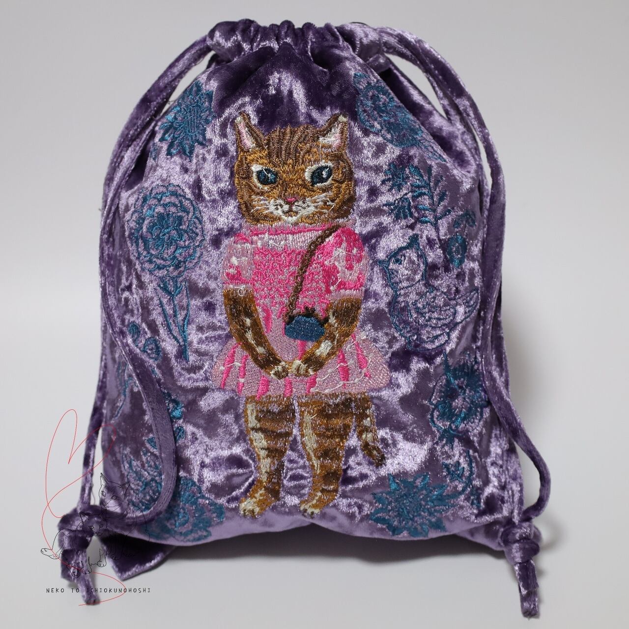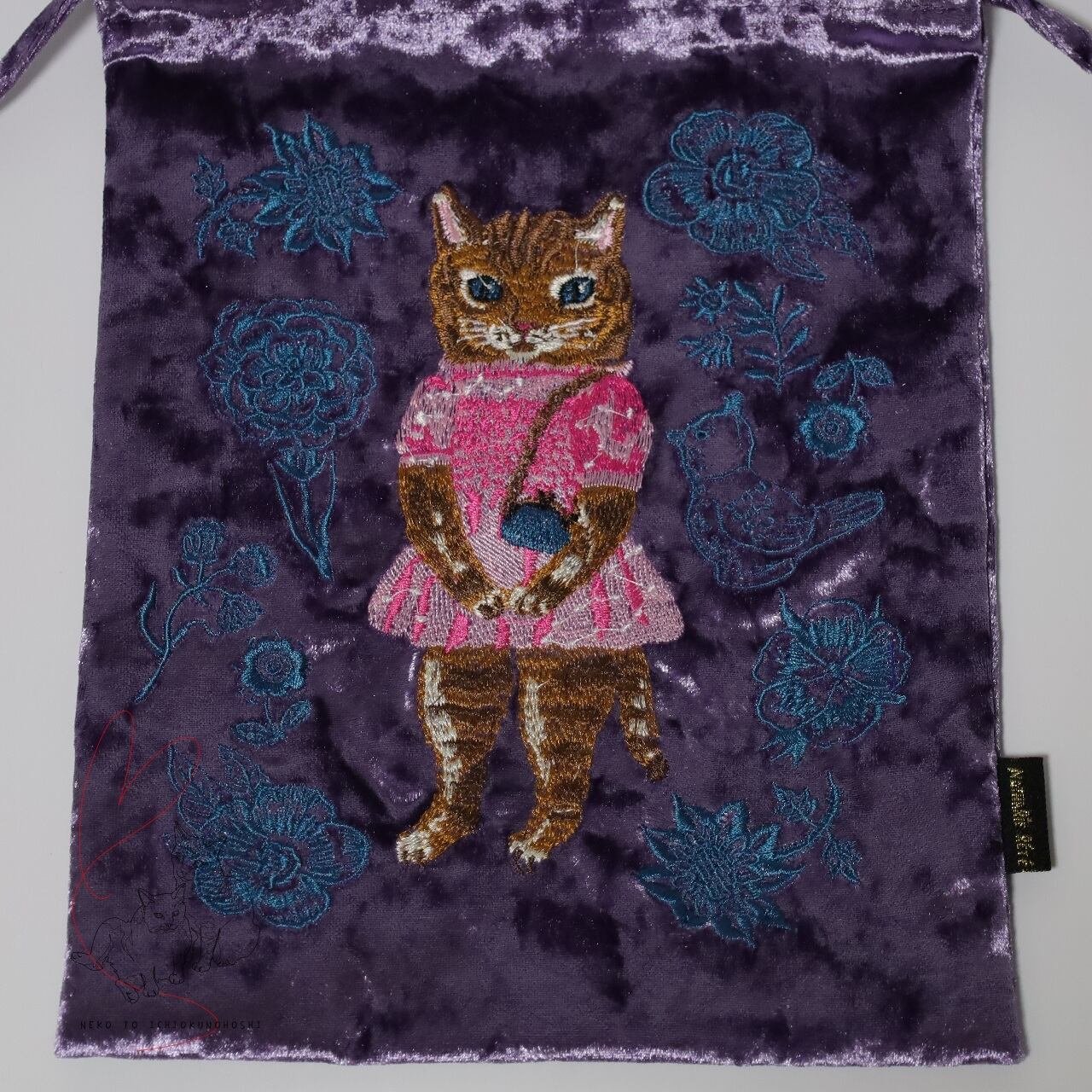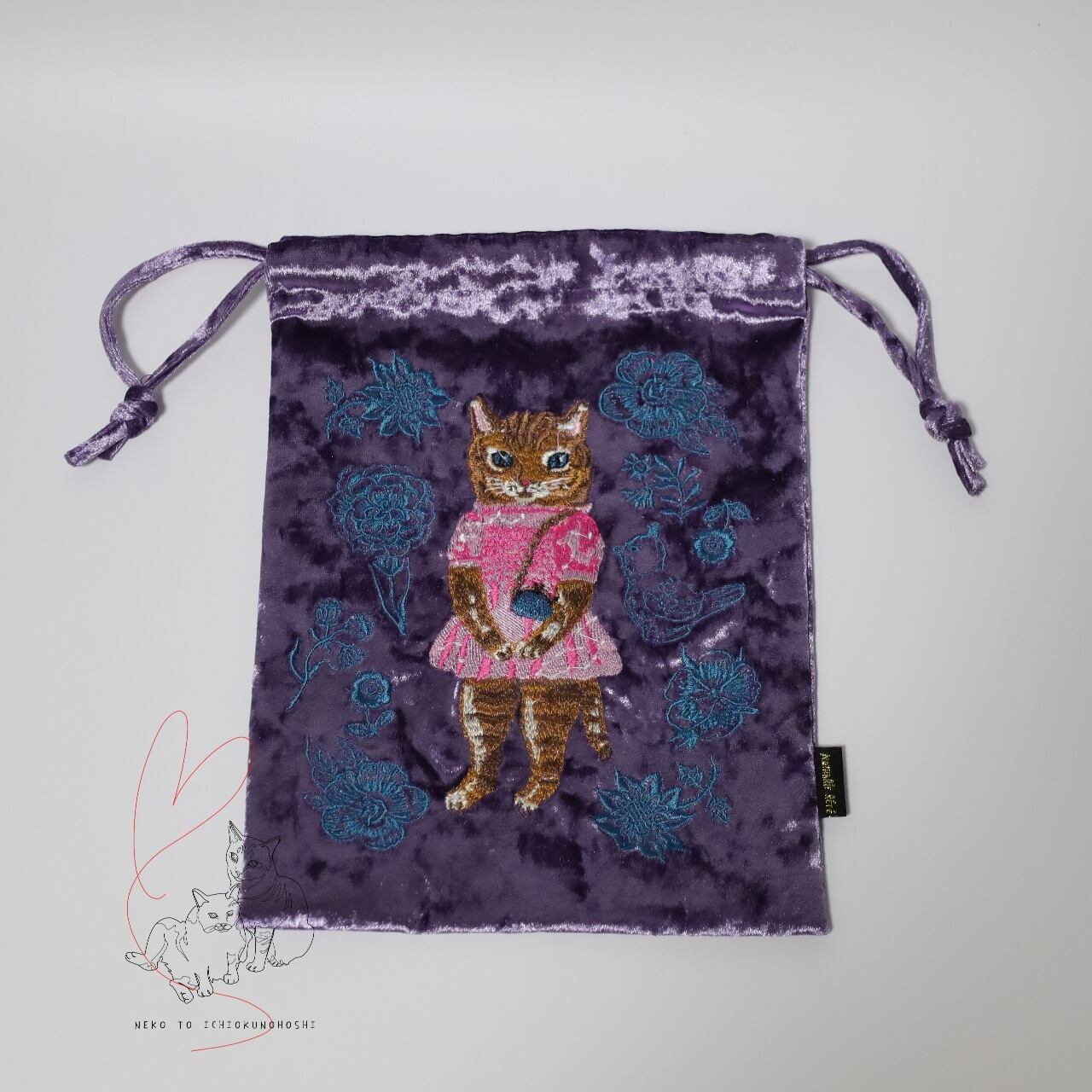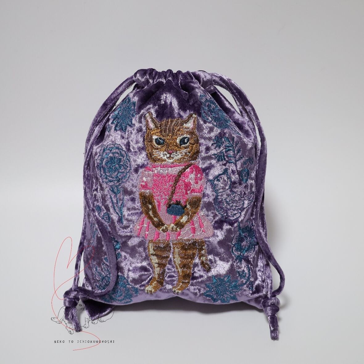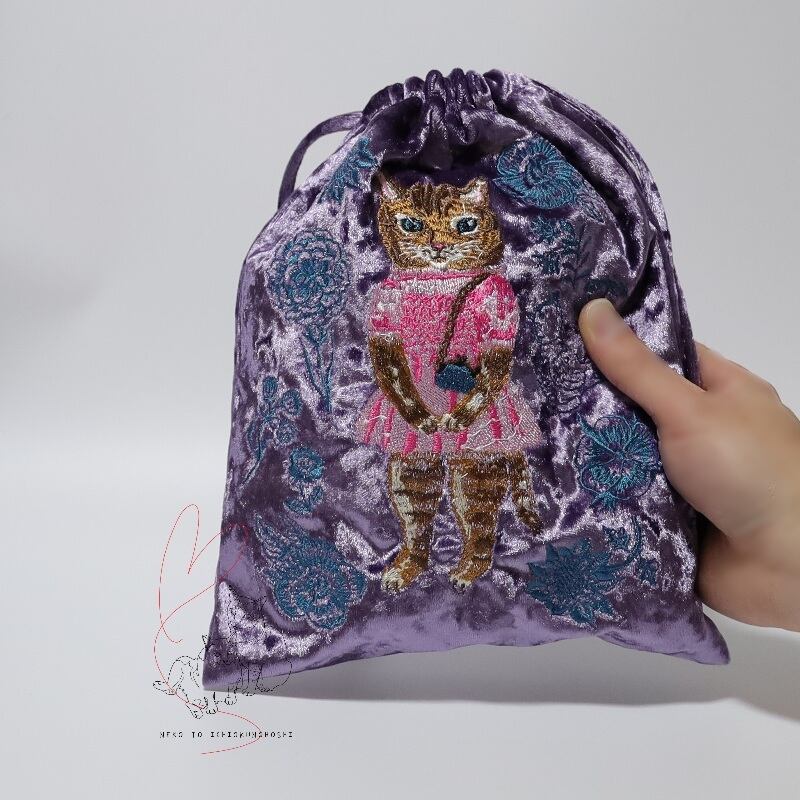 なめらかなベロア生地に、ナタリー・レテさんの愛らしい動物たちが刺繍で描かれた巾着です。