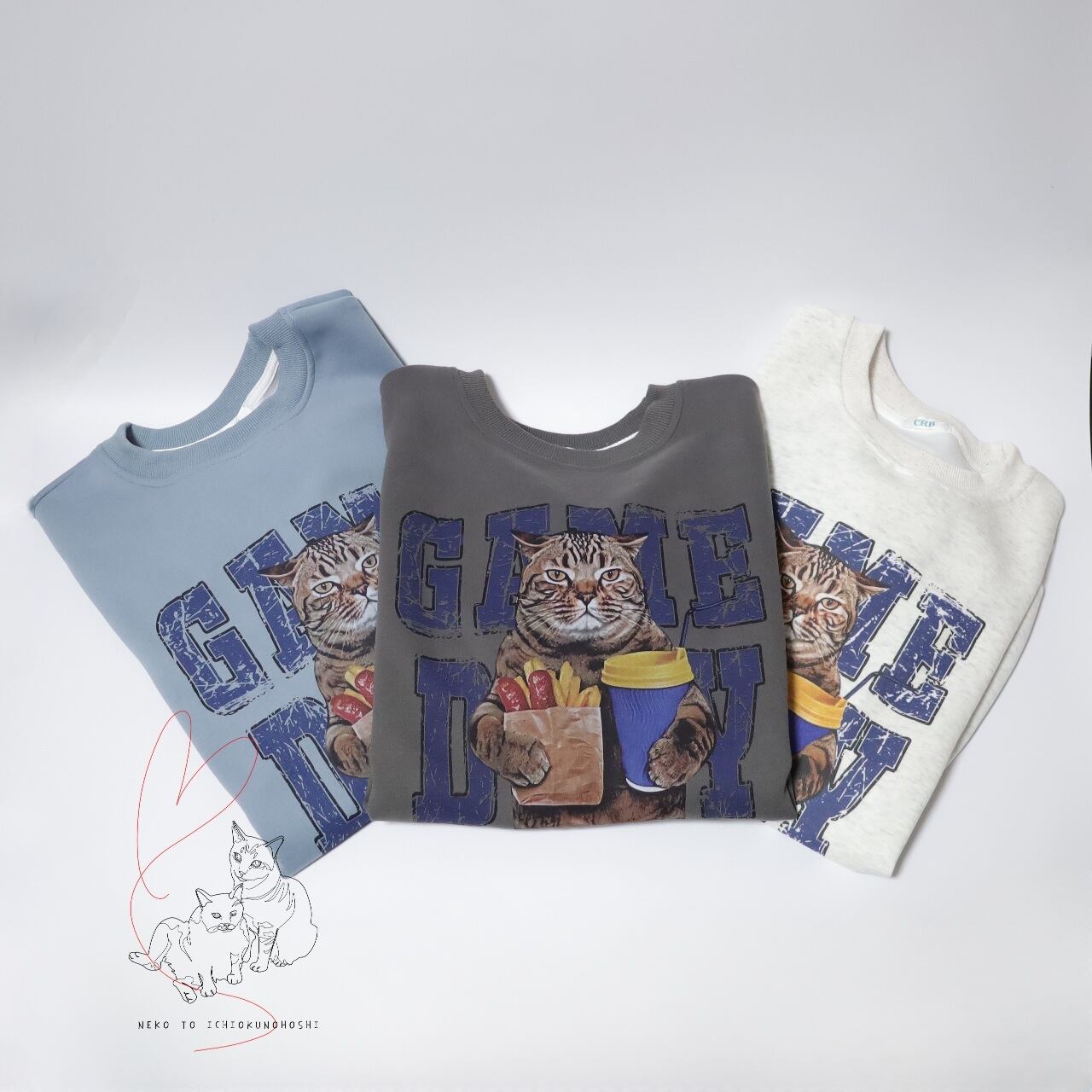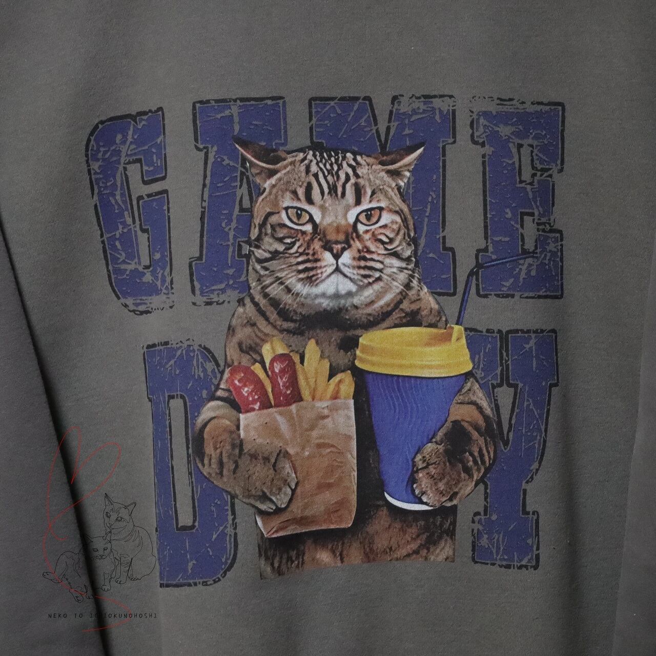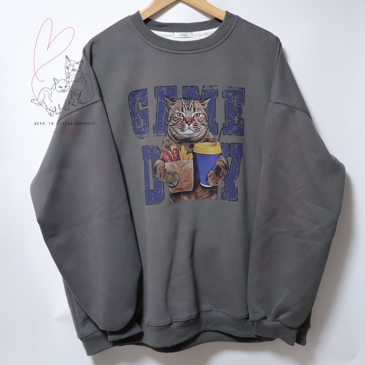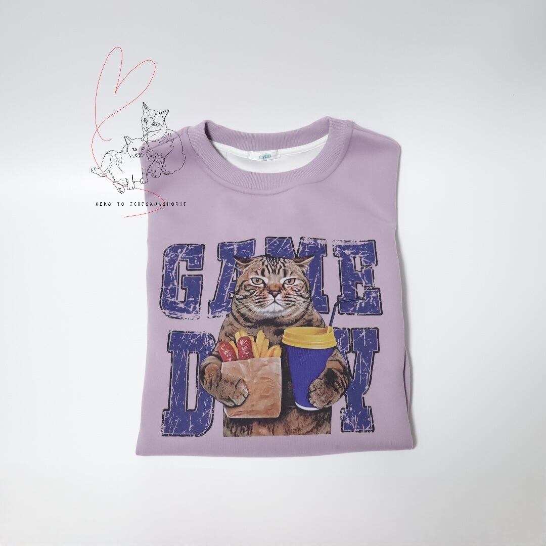 かわいいキジトラさんのプリントが付いた、プルオーバートレーナーです。