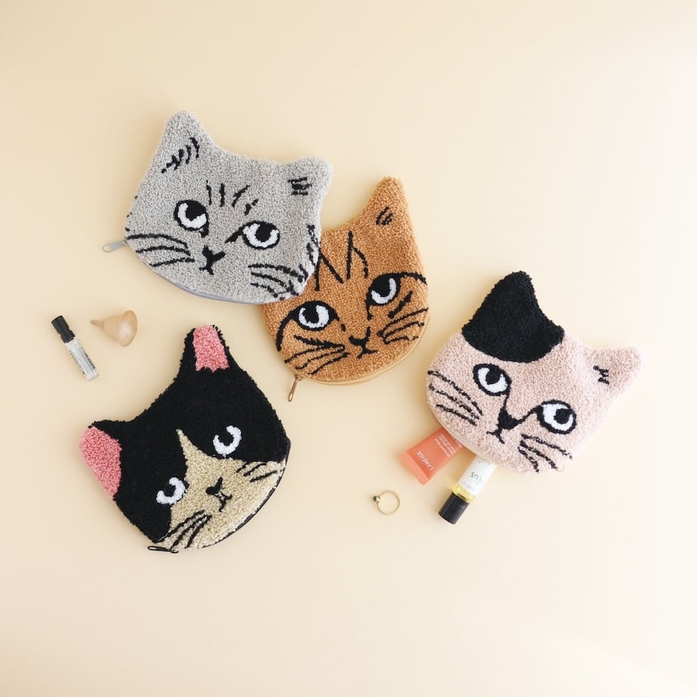 松尾ミユキさんが描いた愛らしいネコのイラストを、ふわふわとしたサガラ刺繍で表現したポーチです。