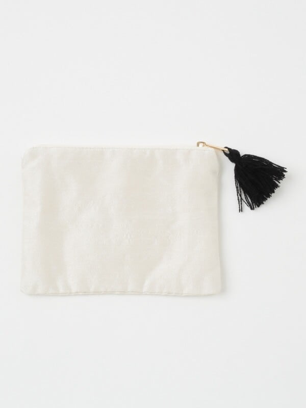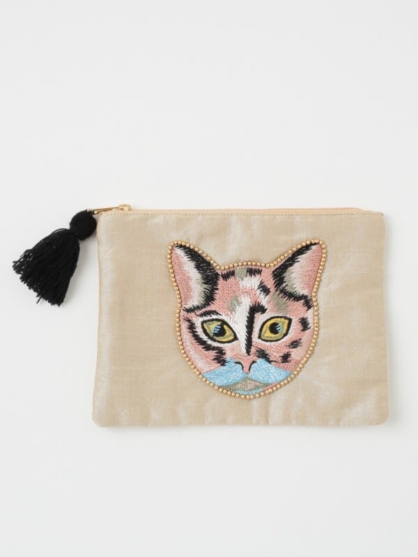 光沢のあるポリエステル生地に猫のモチーフが刺繍されたポーチです。