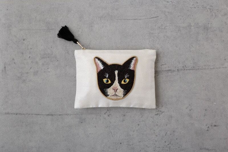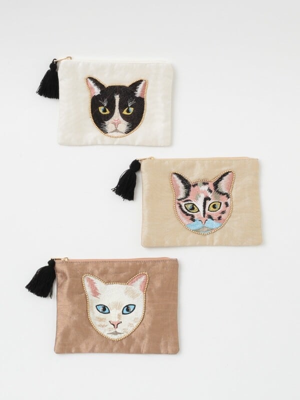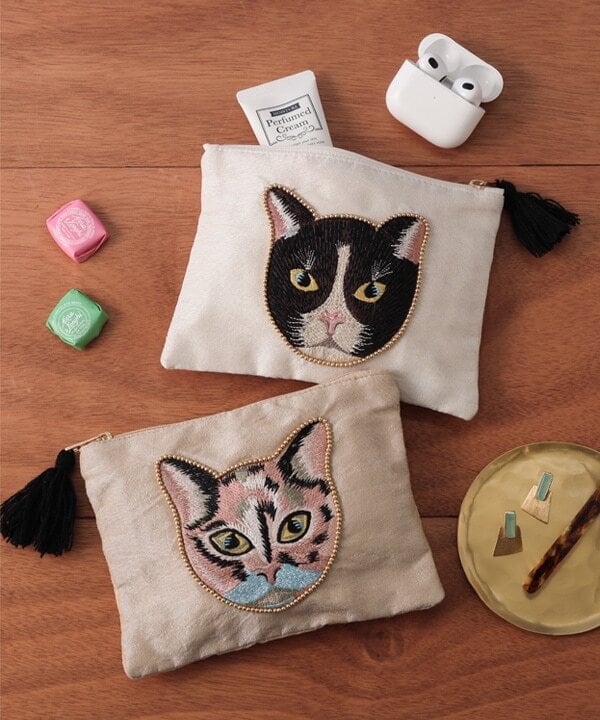 光沢のあるポリエステル生地に猫のモチーフが刺繍されたポーチです。