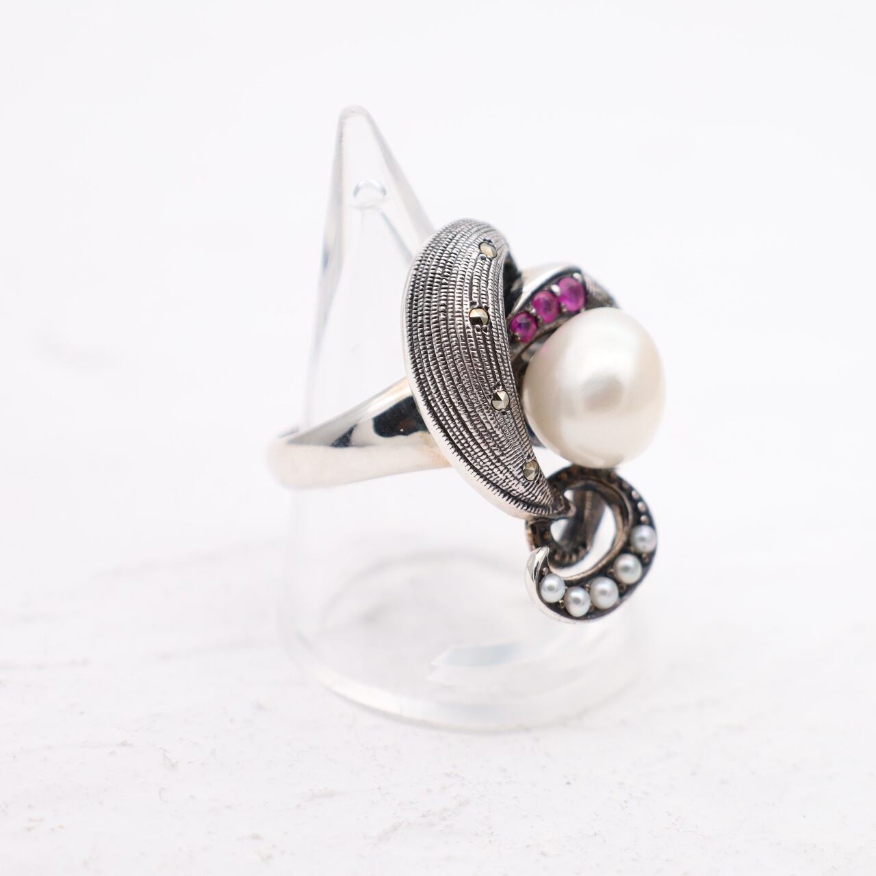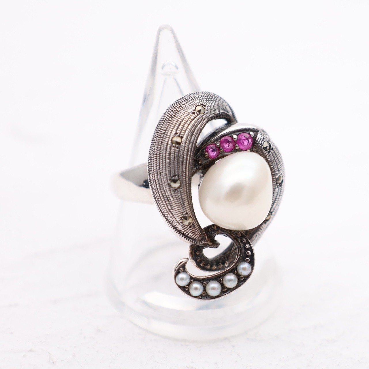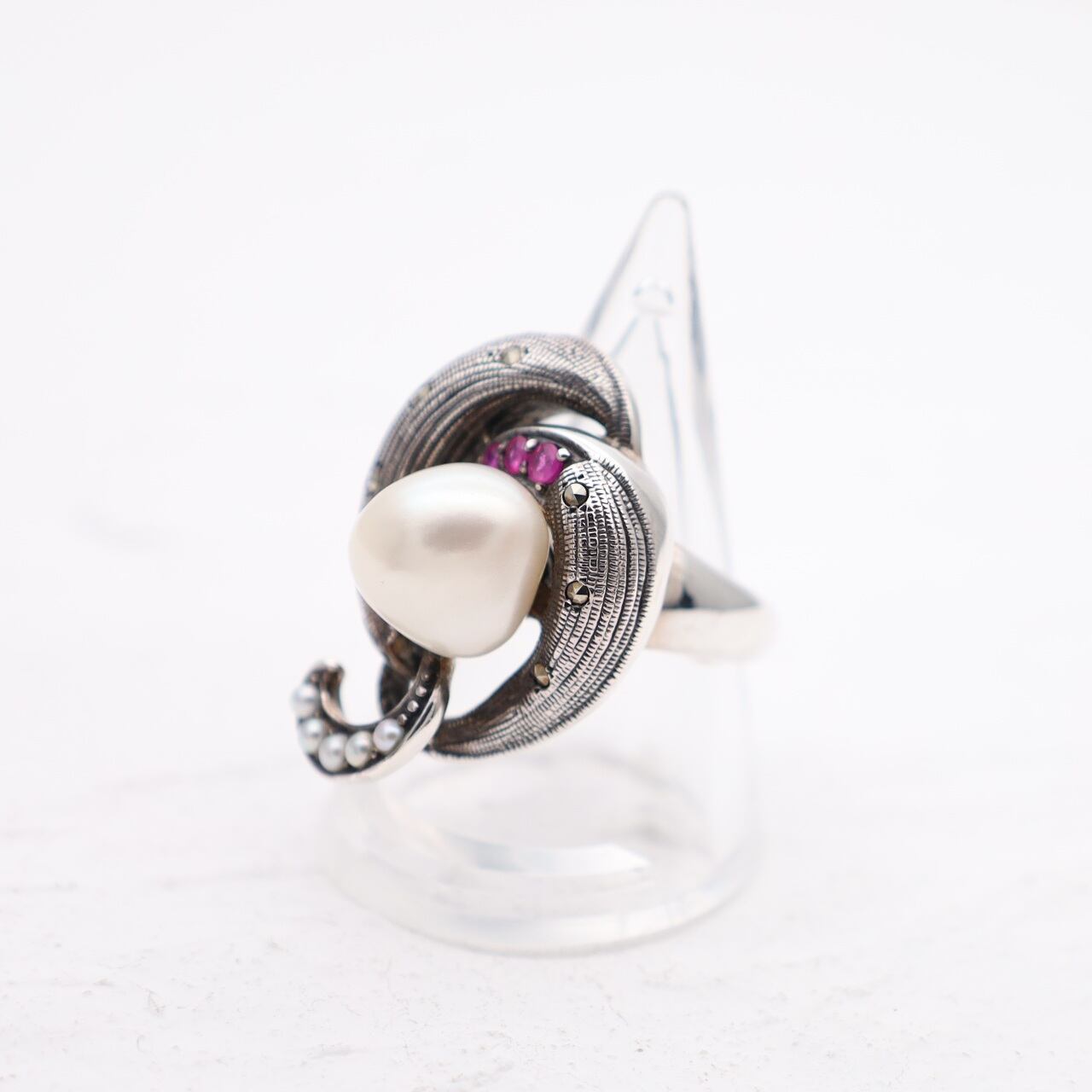華やかなルビーとバロックパールがエレガントで、添えられたシードパールは控えめながらも上品なアクセントになっています。