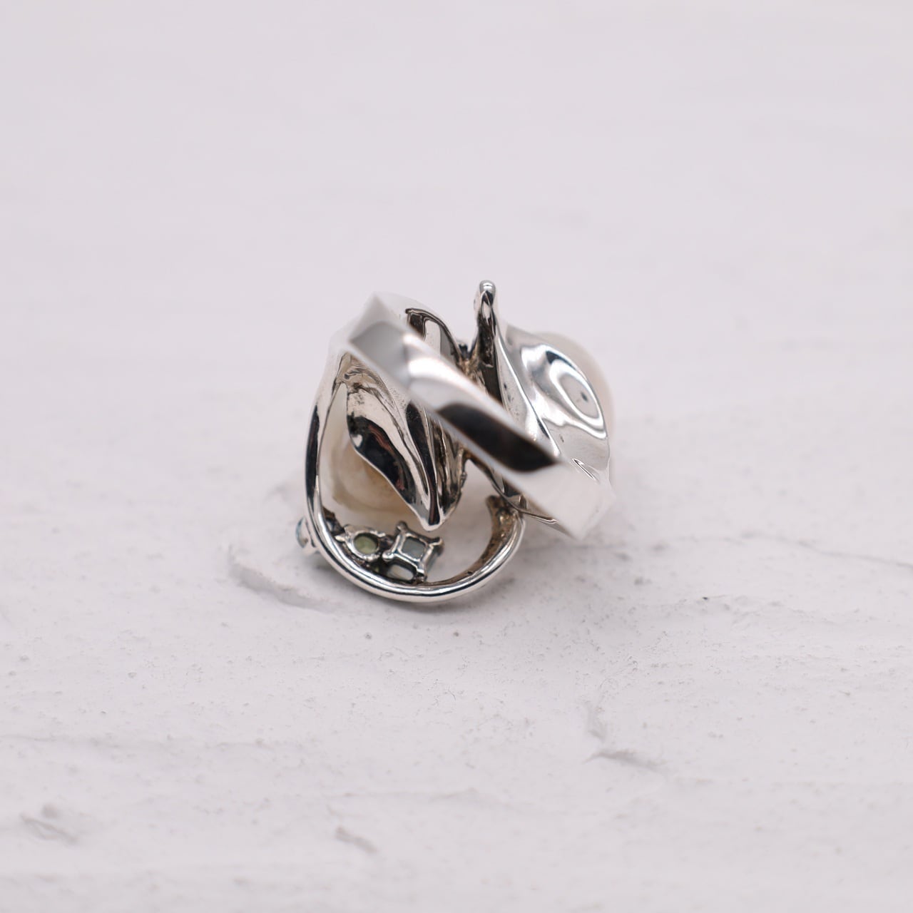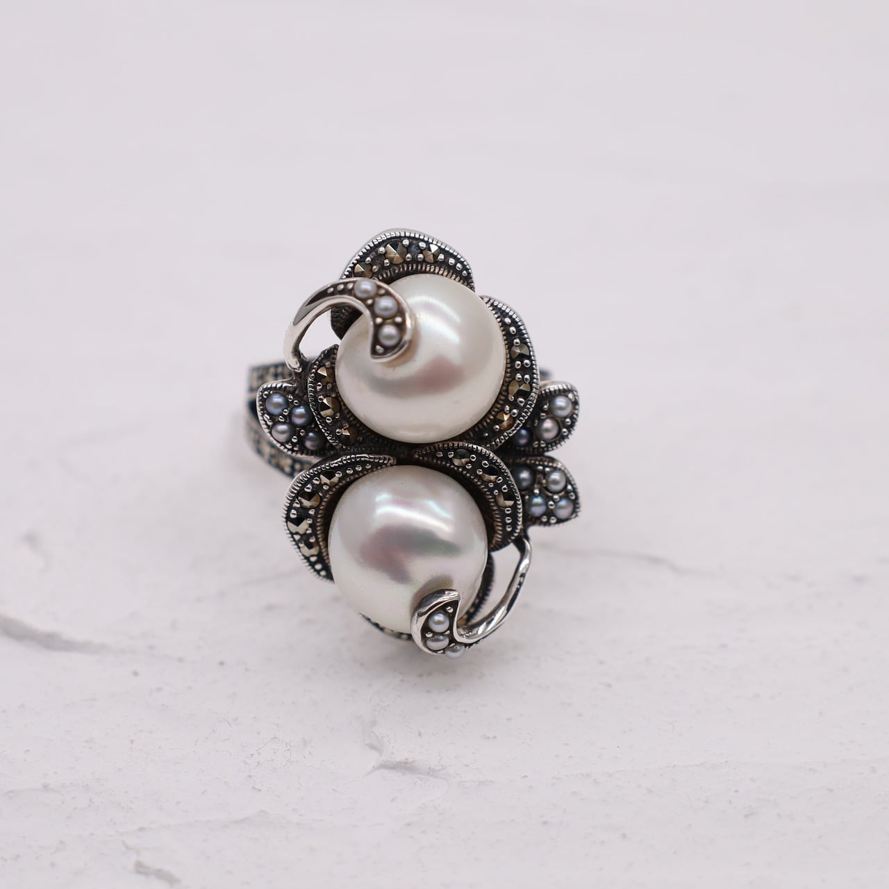 大粒のバロックパールを贅沢に二粒使用し、輝くマルカジットで装飾したクラシカルなデザインの美しい指輪です。
