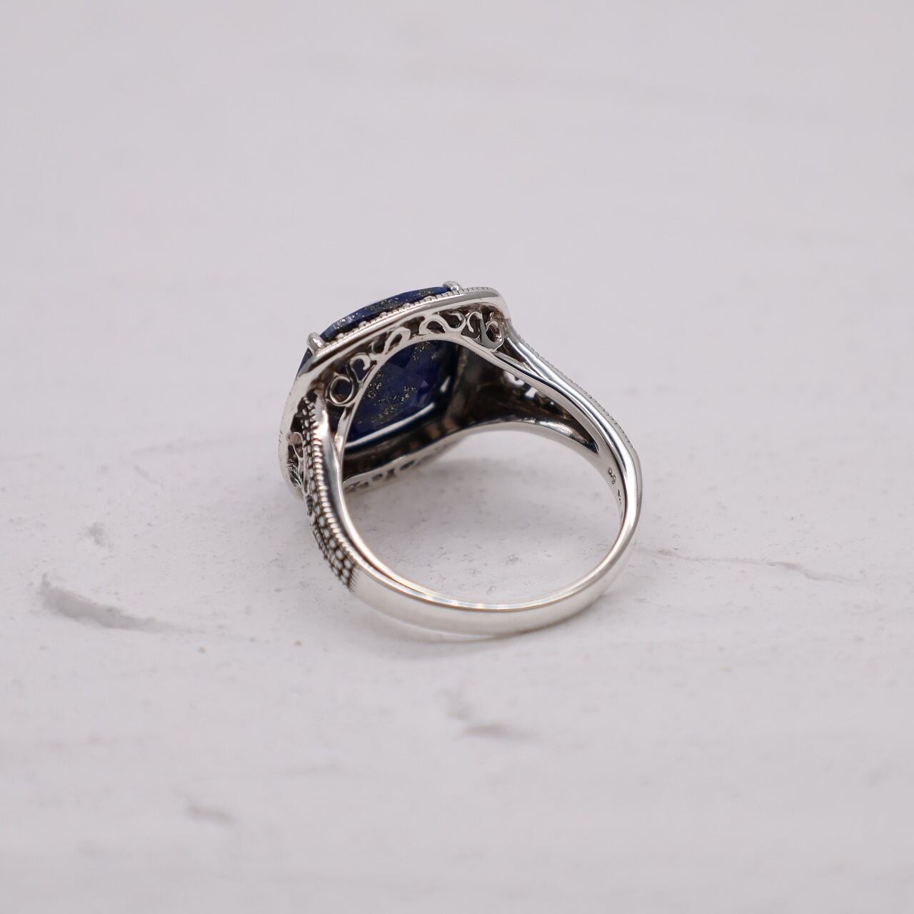 スクエアにカットされたラピスラズリが存在感を放ち、マルカジットの輝きが指先を華やかに彩ります。